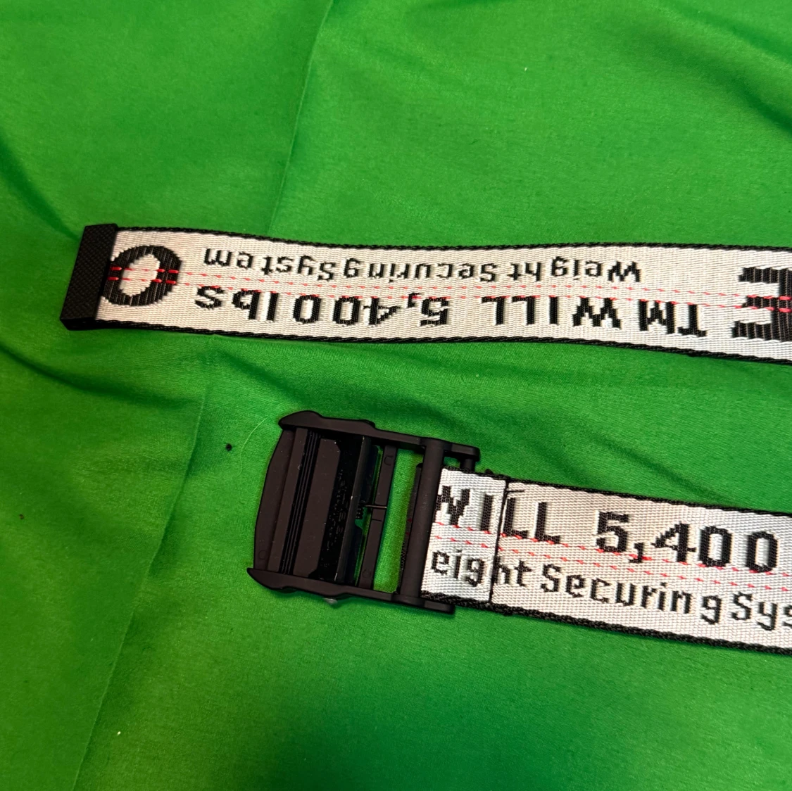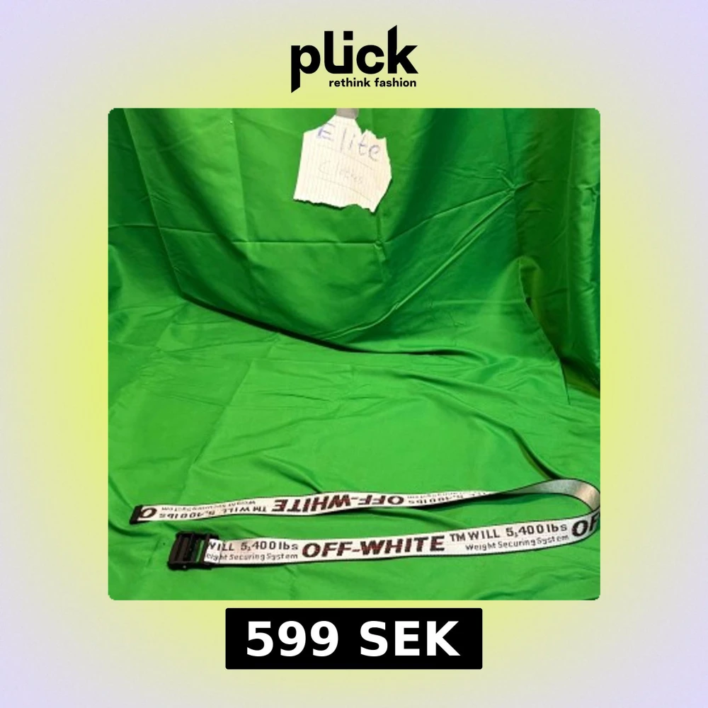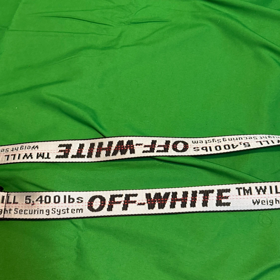 Säljer ett ikoniskt Off-White industribälte i vit textil med svart spänne. Bältet har tydlig svart och röd text med märkets logga och detaljer som '5,400 lbs' och 'Weight Securing System'. Perfekt för att lyfta din streetwear-look.Liknande modell som originalet!
