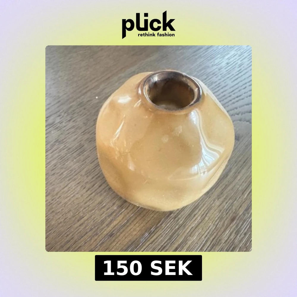 Bilderna visar en beige, glaserad ljusstake med oregelbunden form. Ytan är blank och ljusstaken ser ut att vara i gott skick utan synliga sprickor eller större skador. Perfekt som inredningsdetalj för hemmet.