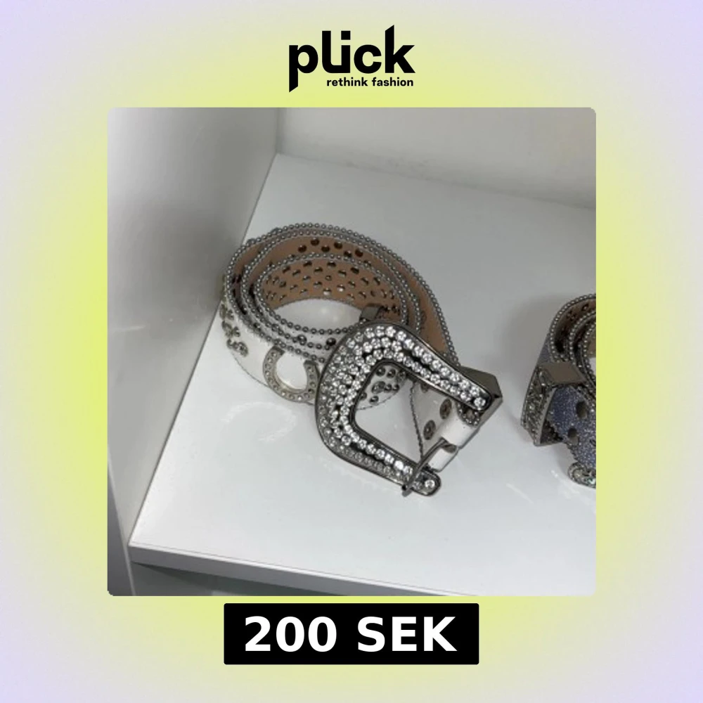 Säljer ett snyggt bälte i silverfärg med massor av glittrande strass och små nitar längs hela bältet. Spännet är också täckt av strass för extra bling. Perfekt accessoar för att lyfta vilken outfit som helst.