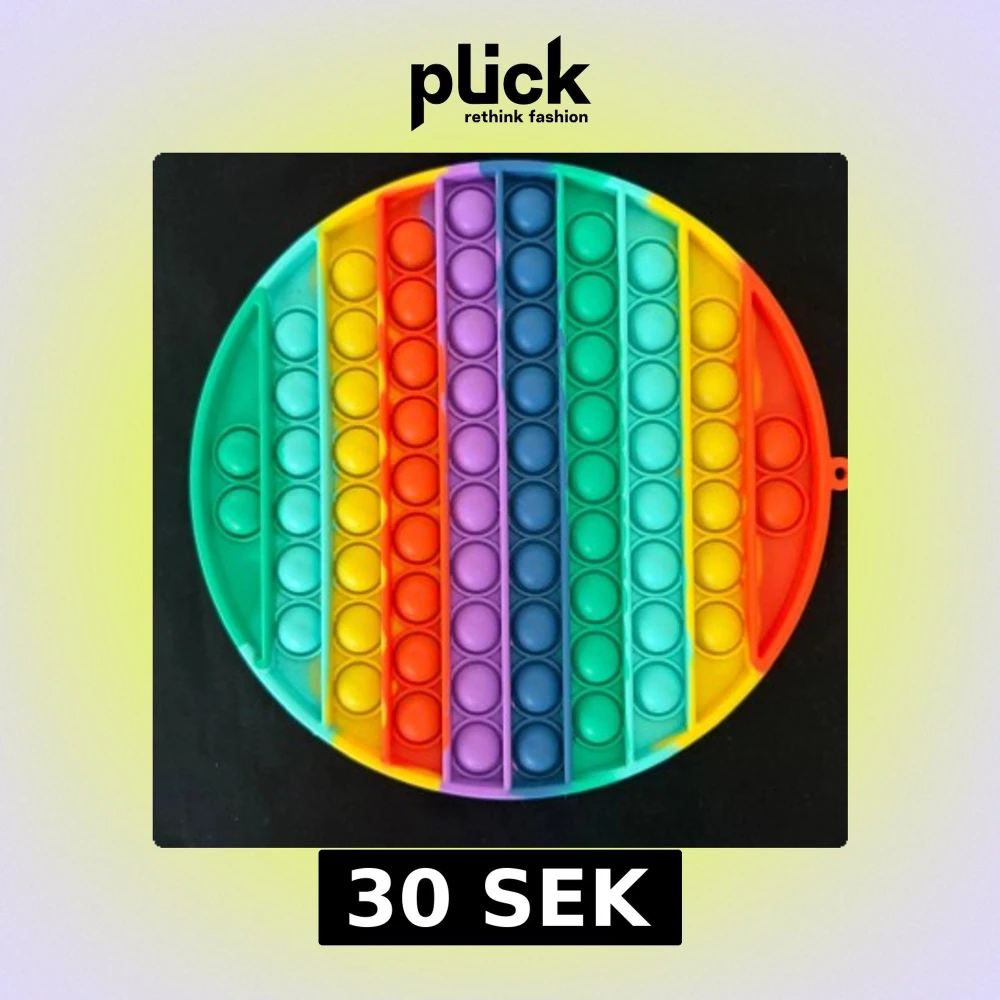 Säljer en rund pop it-leksak i regnbågens alla färger. Den är tillverkad i mjuk silikon och har bubblor att trycka på för en avslappnande känsla. Perfekt för att sysselsätta händerna eller minska stress.