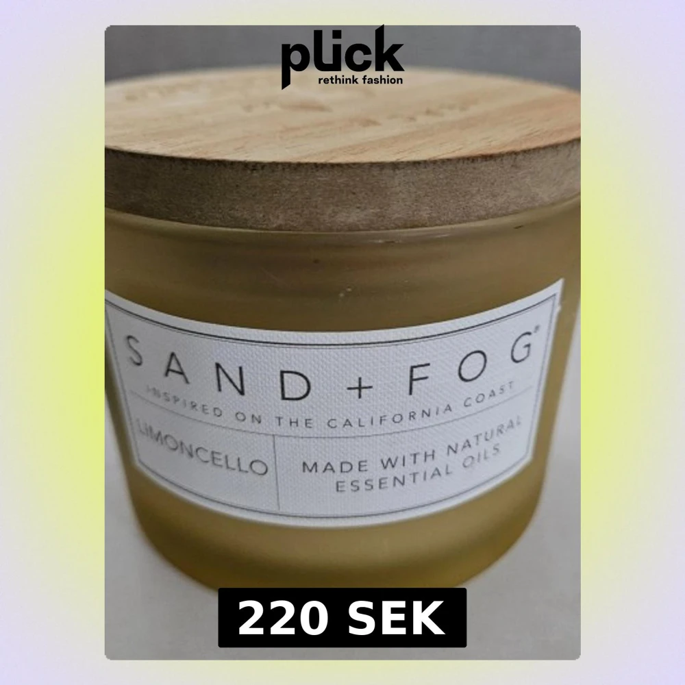 Säljer ett gult doftljus från Sand + Fog med doften Limoncello. Ljuset kommer i en frostad glasburk med ett snyggt lock i trä där det står 'PEACE' och har ett ingraverat bladmönster. Tillverkat med naturliga eteriska oljor.