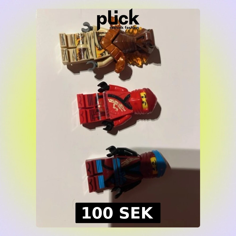 Säljer tre LEGO Ninjago minifigurer: en mumie med guldbrun rustning och detaljer, en röd ninja med gulddrake på bröstet och en röd och blå ninja med svarta armar och blått pannband. Perfekt till samlingen eller lek!