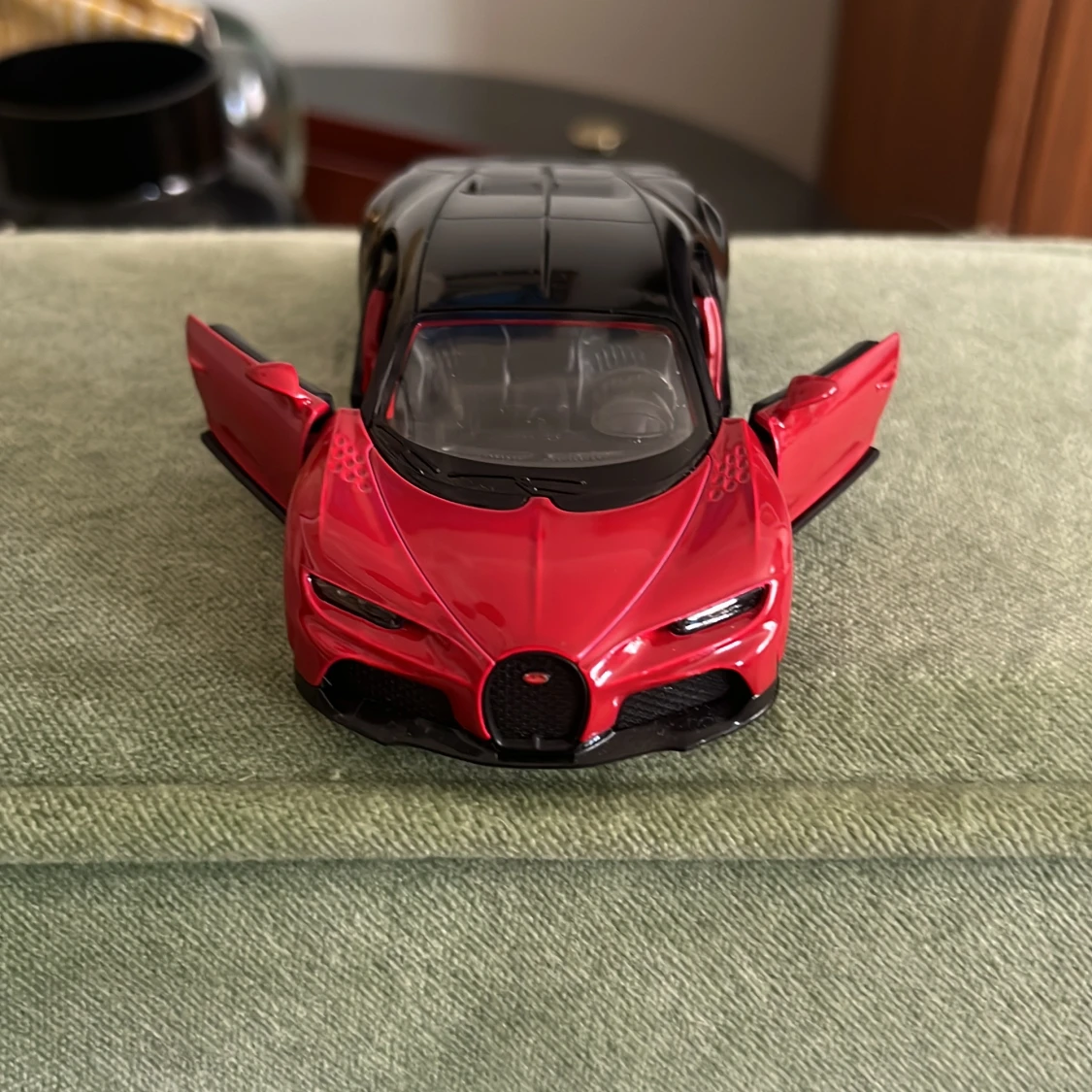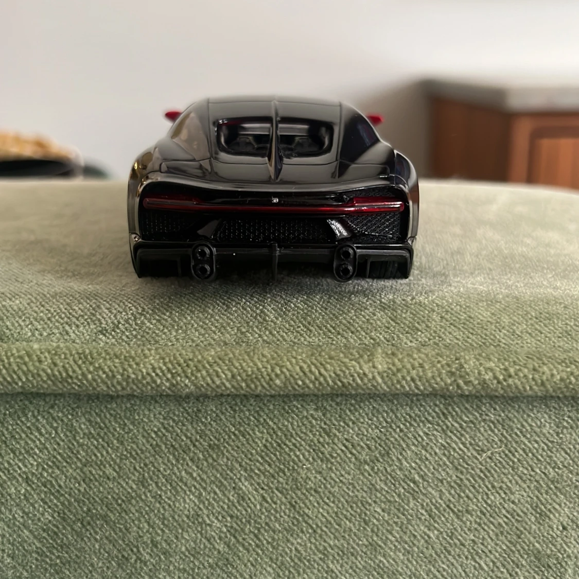 Svart röd Bugatti Chiron, perfekt för bilälskare samt småbarn med intresset av bilar Den här bilen har en roller back start