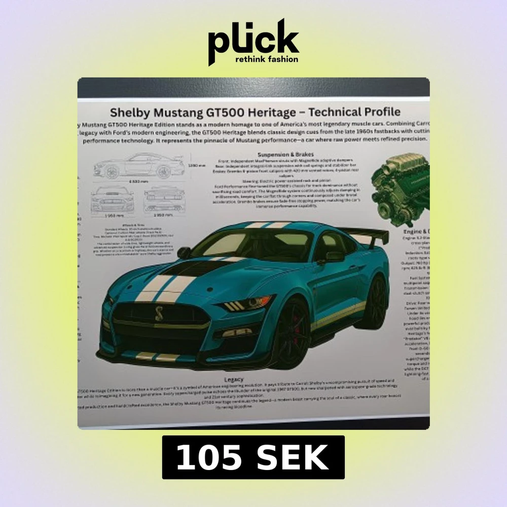 A3 poster av Shelby Mustang GT500 Heritage – en ikonisk amerikansk muskelbil med modern teknik och rå kraft. Perfekt för bilentusiaster som älskar fart, design och racing.