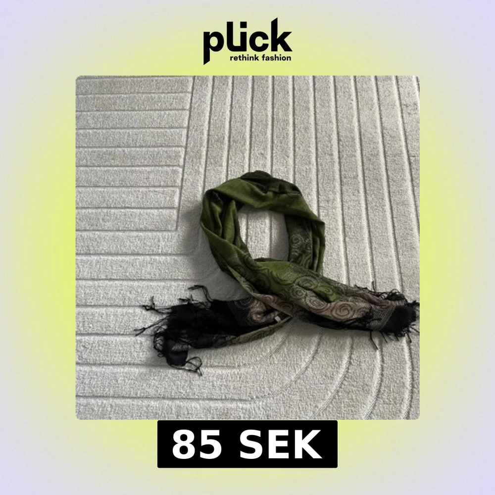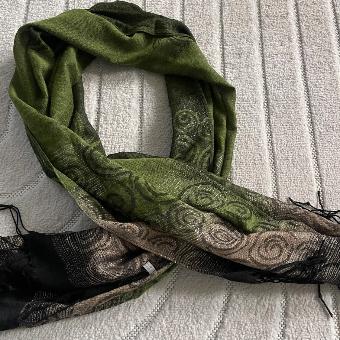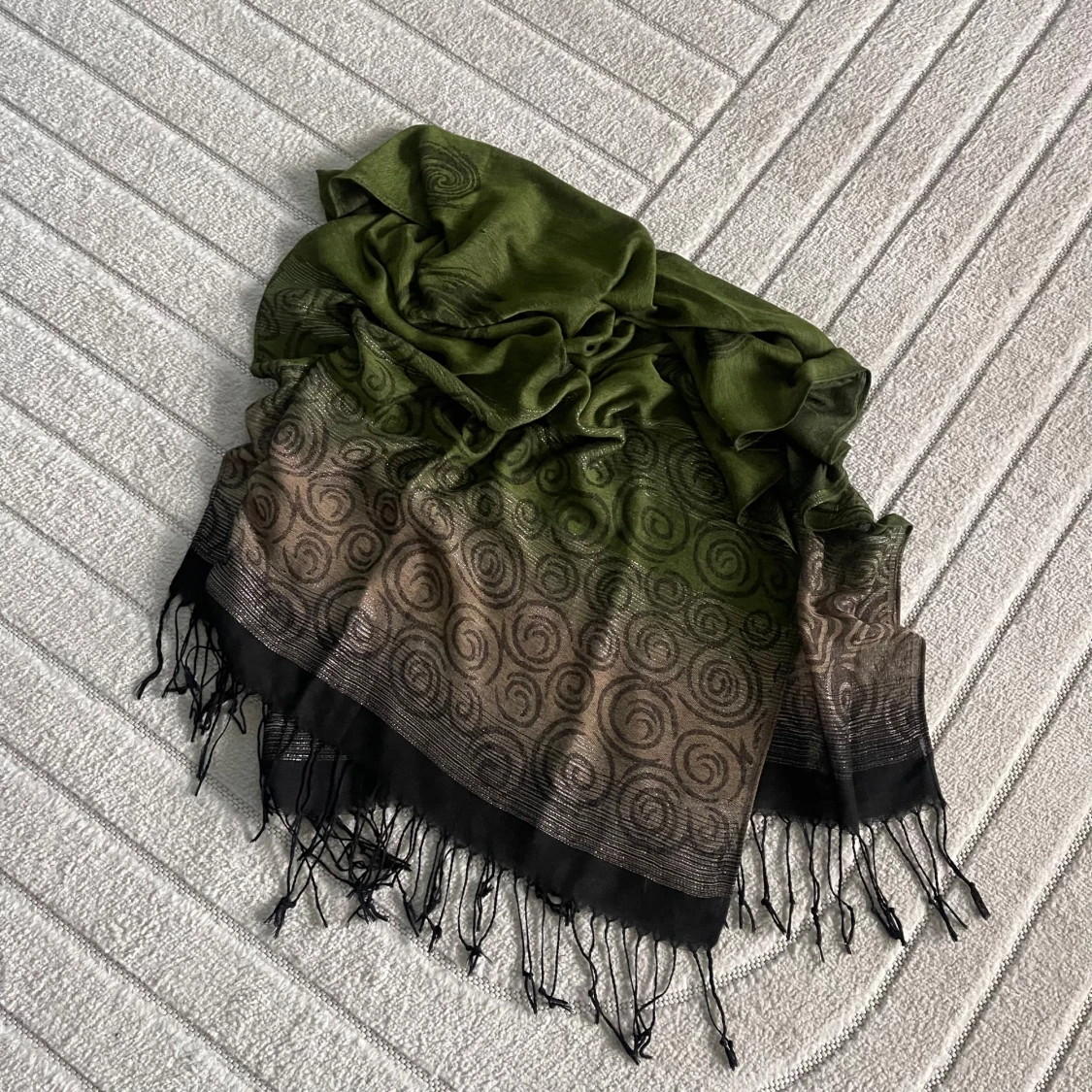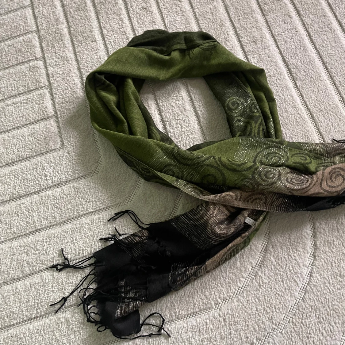 Snygg halsduk i grönt och svart med spiralformade mönster och fransar i ändarna. Färgerna skiftar från olivgrönt till svart och beige, vilket ger en cool och unik look. Perfekt accessoar för att lyfta din outfit.