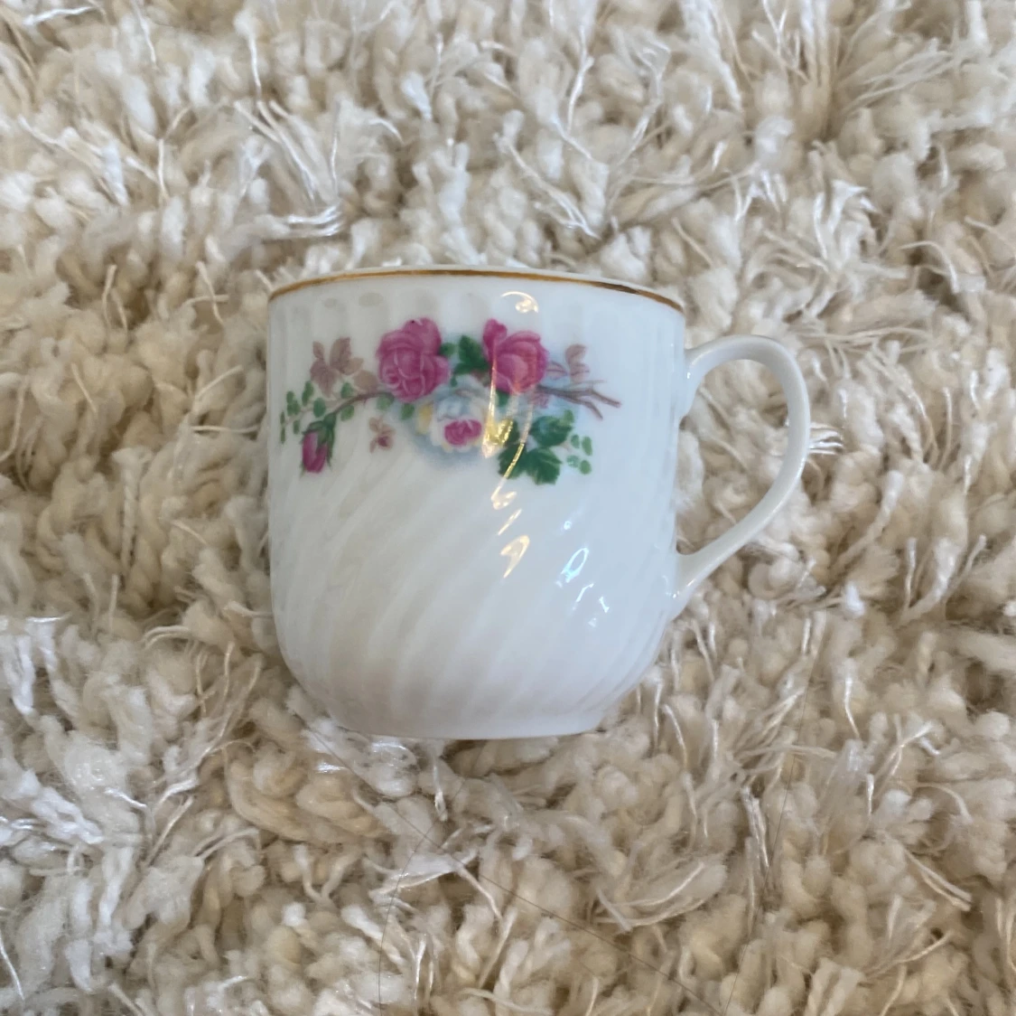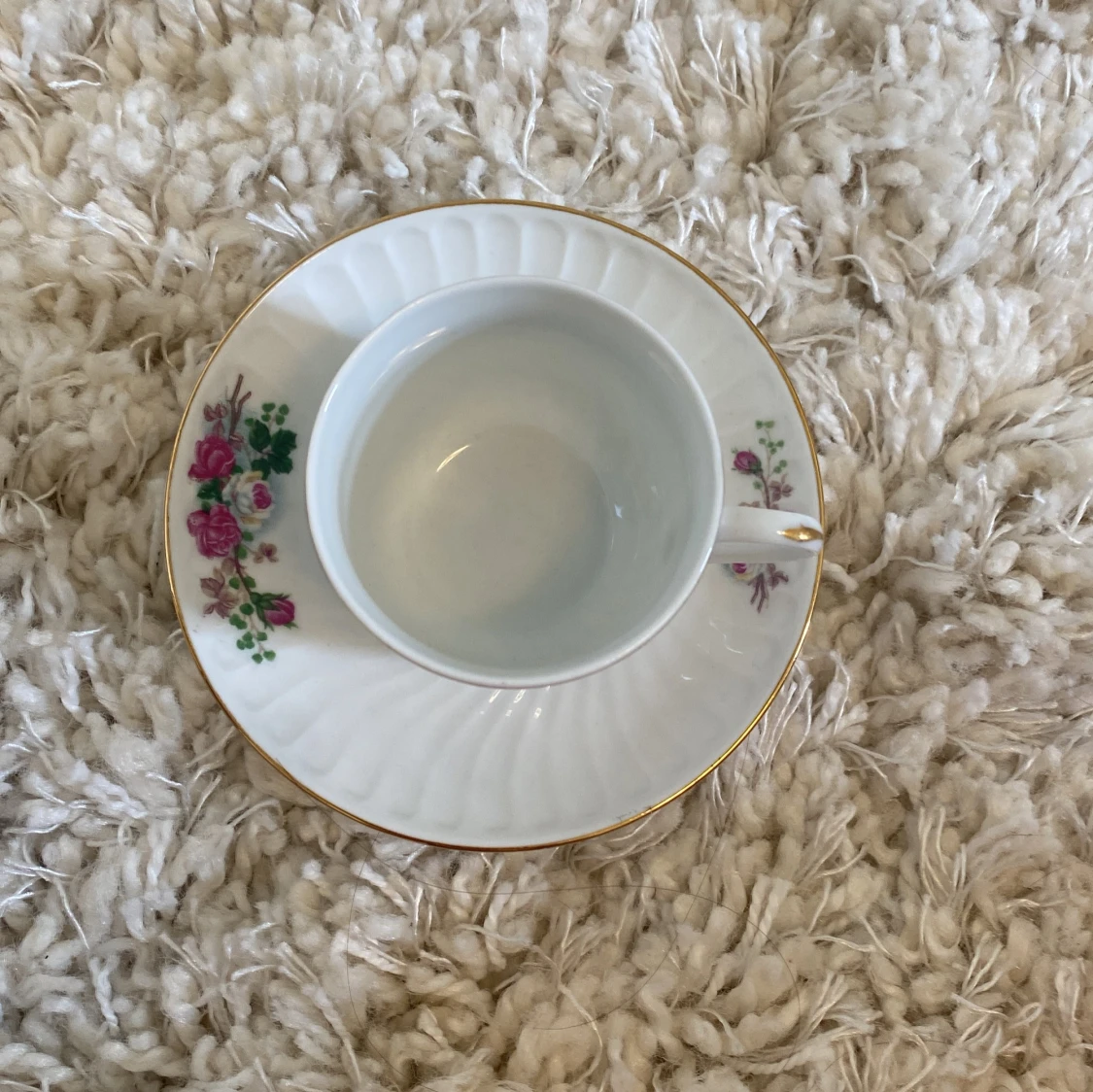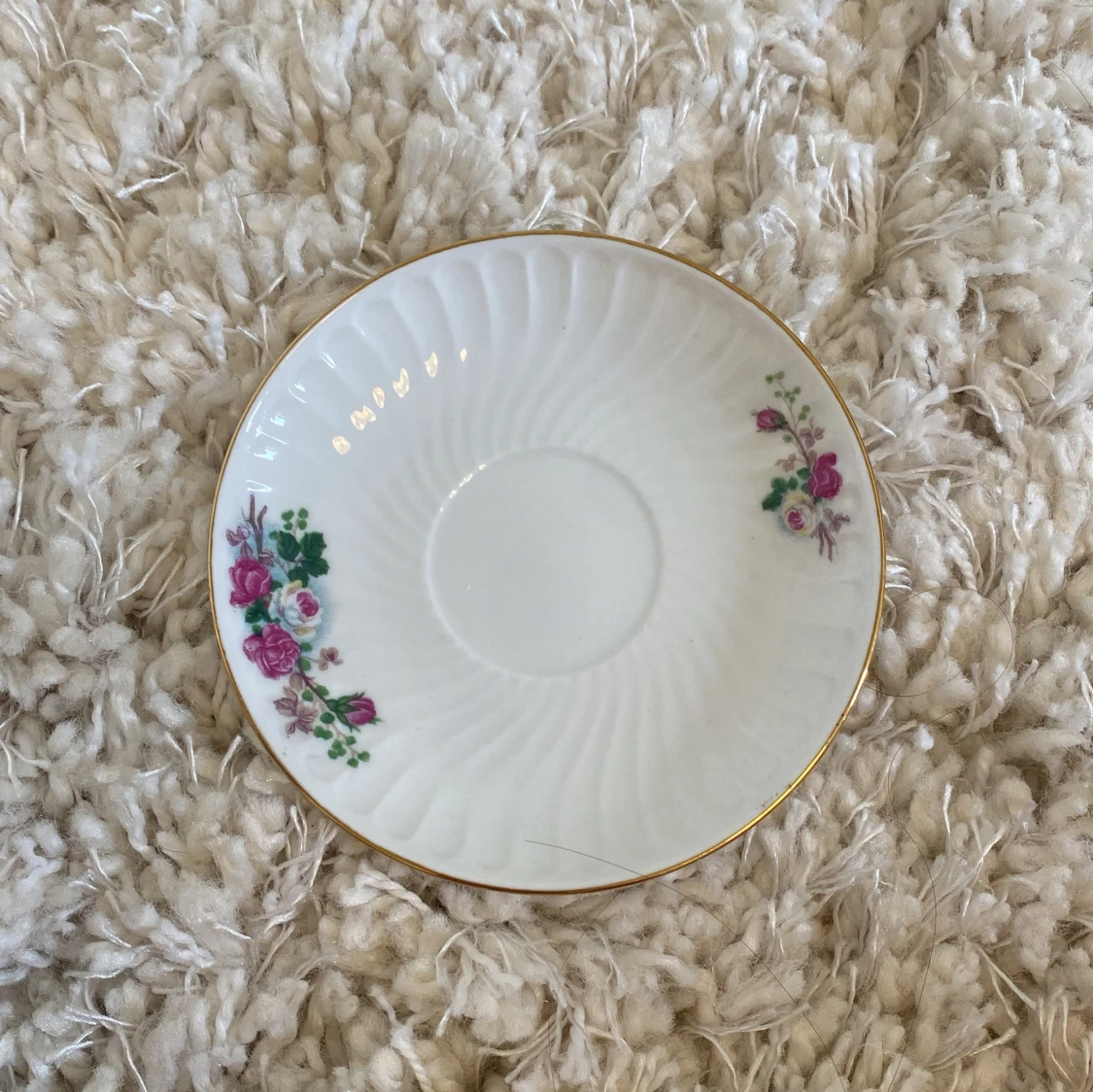 En vit porslin kopp med en liten tallrik till med fina rosa blommor på .