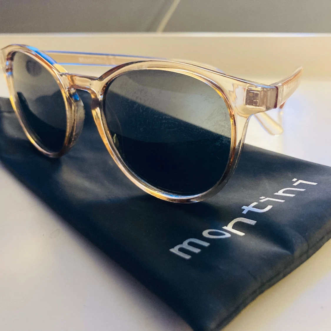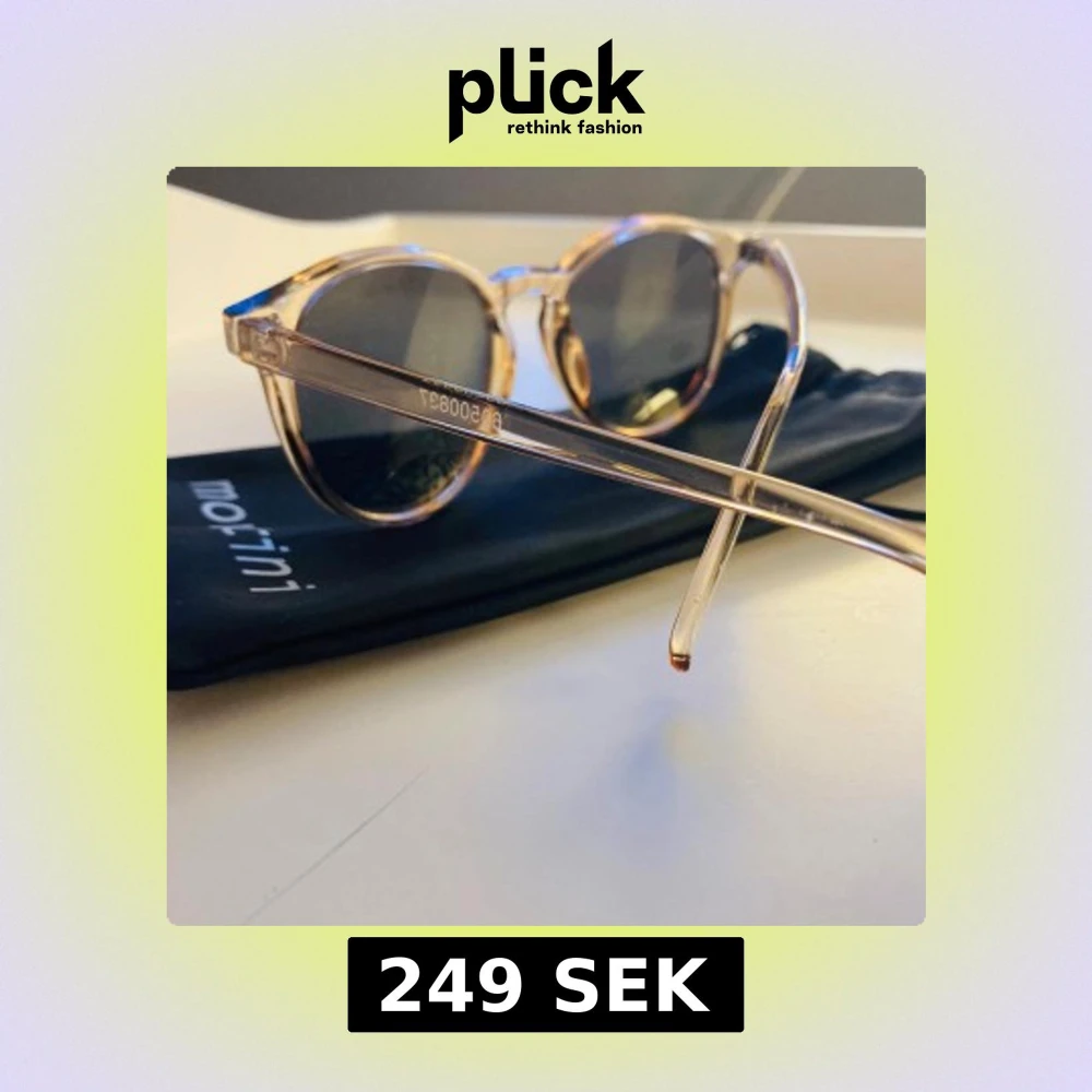 Snygga runda solglasögon från Montini med transparent beige plastbåge och mörka linser. Kommer med ett svart fodral med Montini-logga. Perfekta för att lyfta din stil med en cool och modern touch.