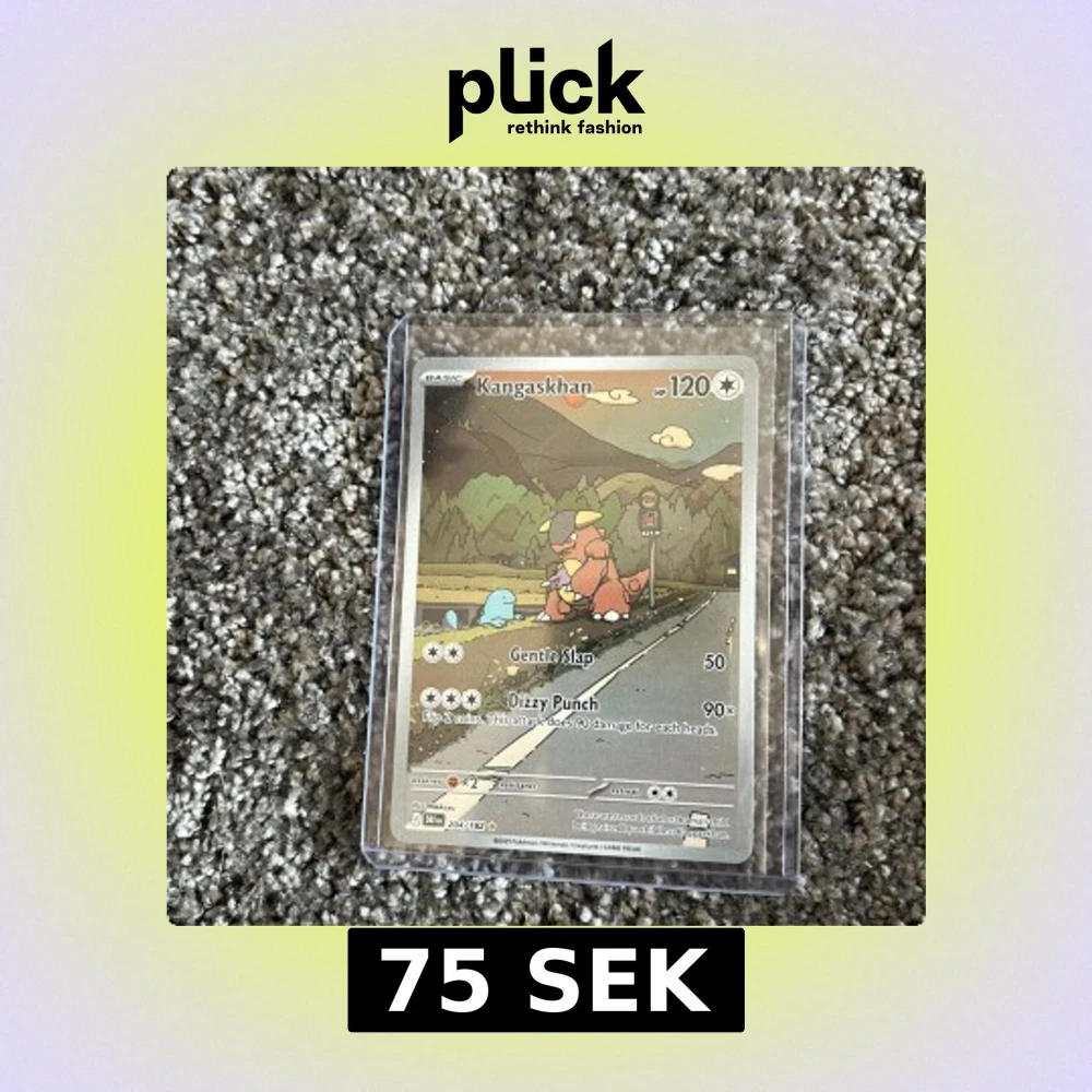 Cool Pokémonkort med Kangaskhan och Squirtle vid en busshållplats, illustrerat i en unik stil. Perfekt för samlare och fans av Pokémon som vill ha något speciellt i sin samling. Kortet är i skyddande plastfodral.