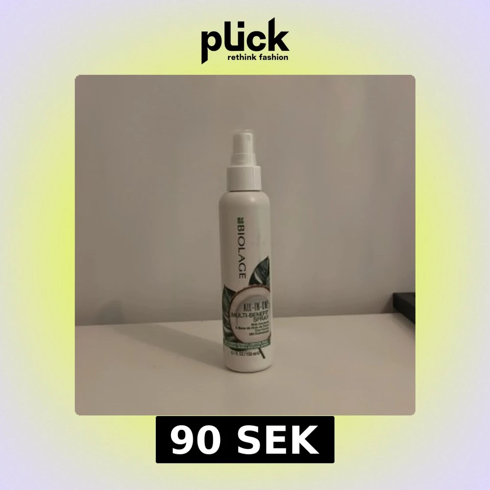 Säljer en Biolage All-In-One Multi-Benefit Spray i en vit flaska med grön logotyp och bladmotiv. Perfekt för att ge håret extra vård och glans. Flaskan har en praktisk sprayfunktion för enkel applicering.😎😎