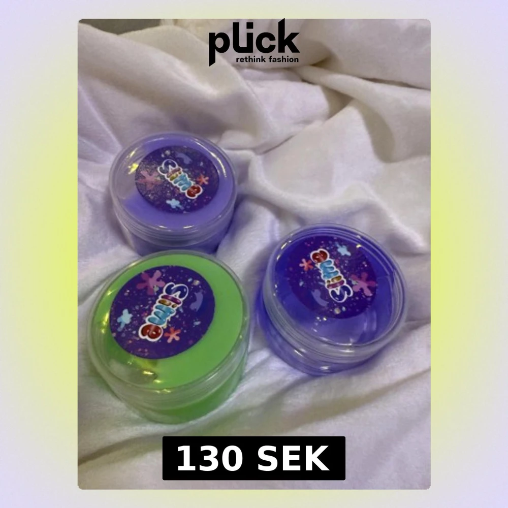 Tre burkar med slime i färgerna lila och grön. Slime kommer i runda plastburkar med färgglad etikett på locket. Perfekt för dig som gillar att leka och skapa roliga texturer. Slime är mjukt och stretchigt, enkelt att forma och klämma på.