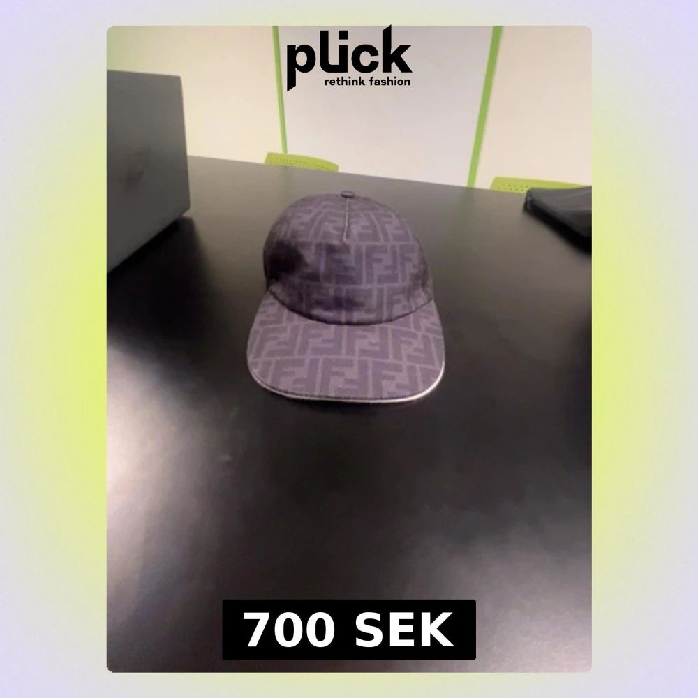 Bilderna visar en mörkgrå Fendi-keps med FF-logga, inte en väst. Kepsen har ett rutigt mönster och är tillverkad i ett tygmaterial.