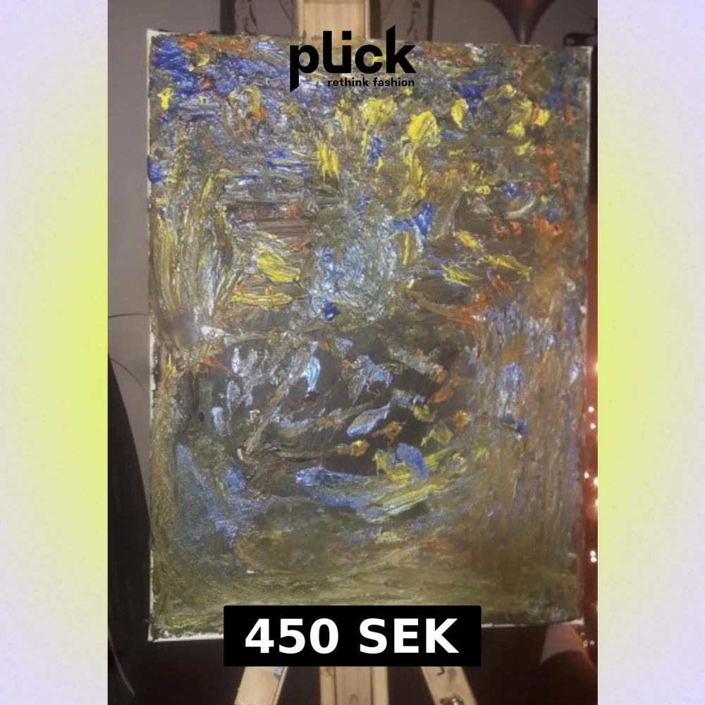En unik och färgstark abstrakt målning med tjocka penseldrag i blått, gult och orange. Perfekt för dig som vill ha något annorlunda och kreativt på väggen. Passar dig som gillar konst och vill uttrycka din personliga stil i rummet.