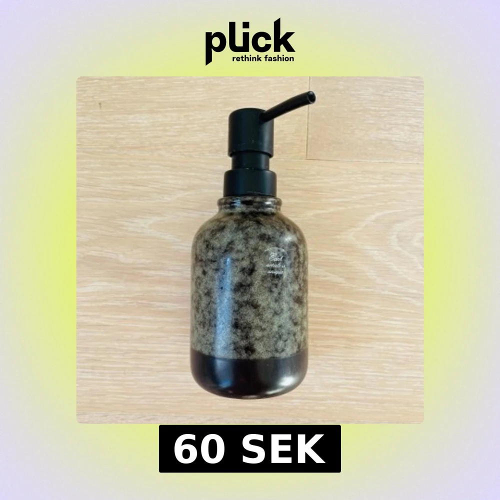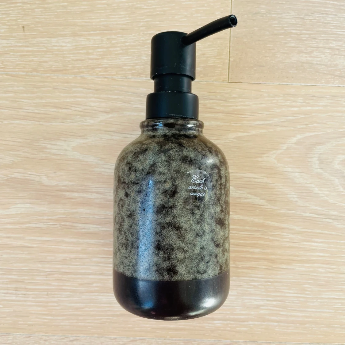 Snygg tvålpump i keramik från JYSK med unikt mönster i grått och svart. Pumpen har en rundad form och svart plastpump, perfekt för att förvara flytande tvål eller sminkborttagning. Varje flaska är unik tack vare det handgjorda mönstret.