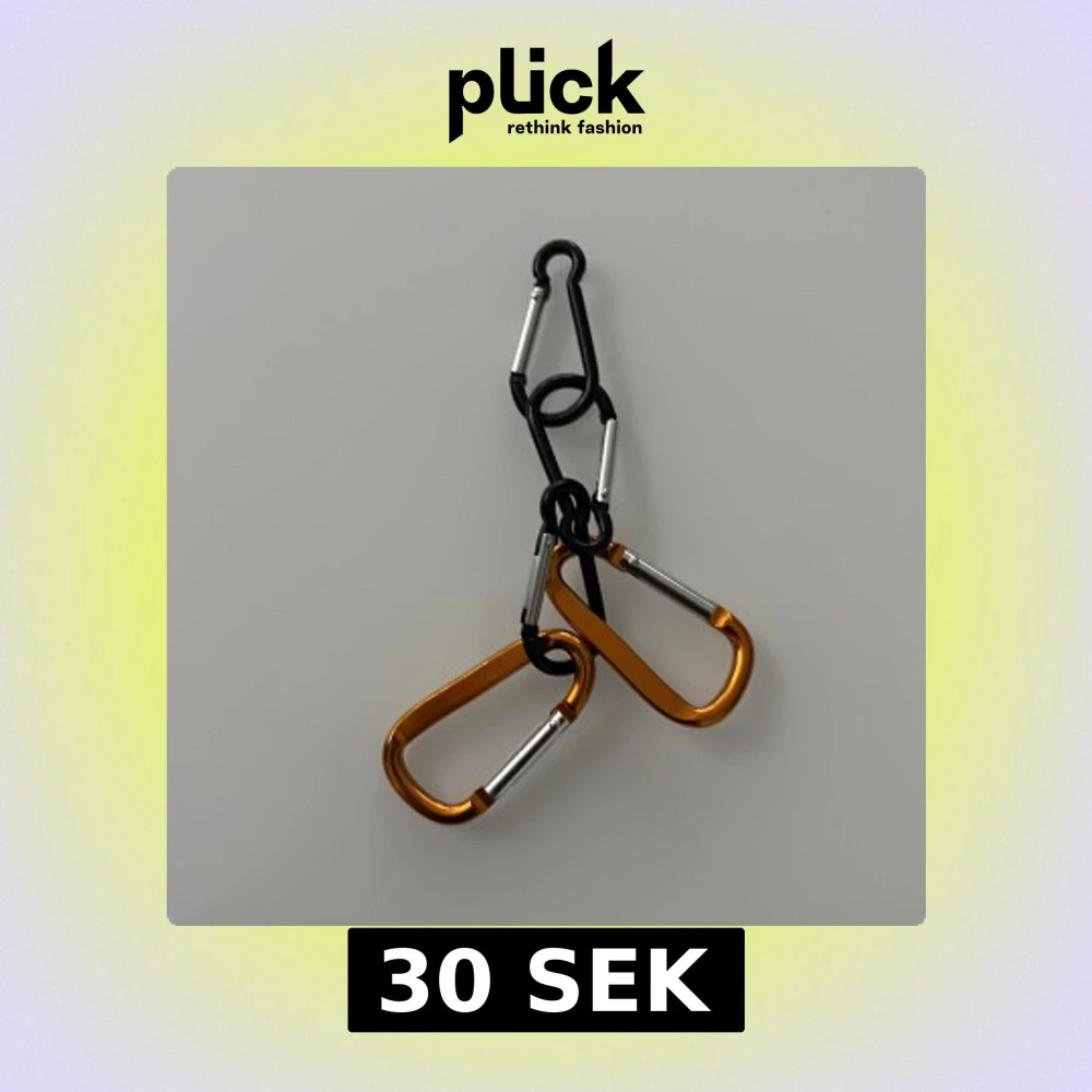 Säljer ett set med fem karbinhakar i metall, tre svarta och två i metallic orange. Perfekta att fästa på väskor eller ryggsäckar för att hänga nycklar eller accessoarer. Snygg och enkel design med silverfärgade öppningar.