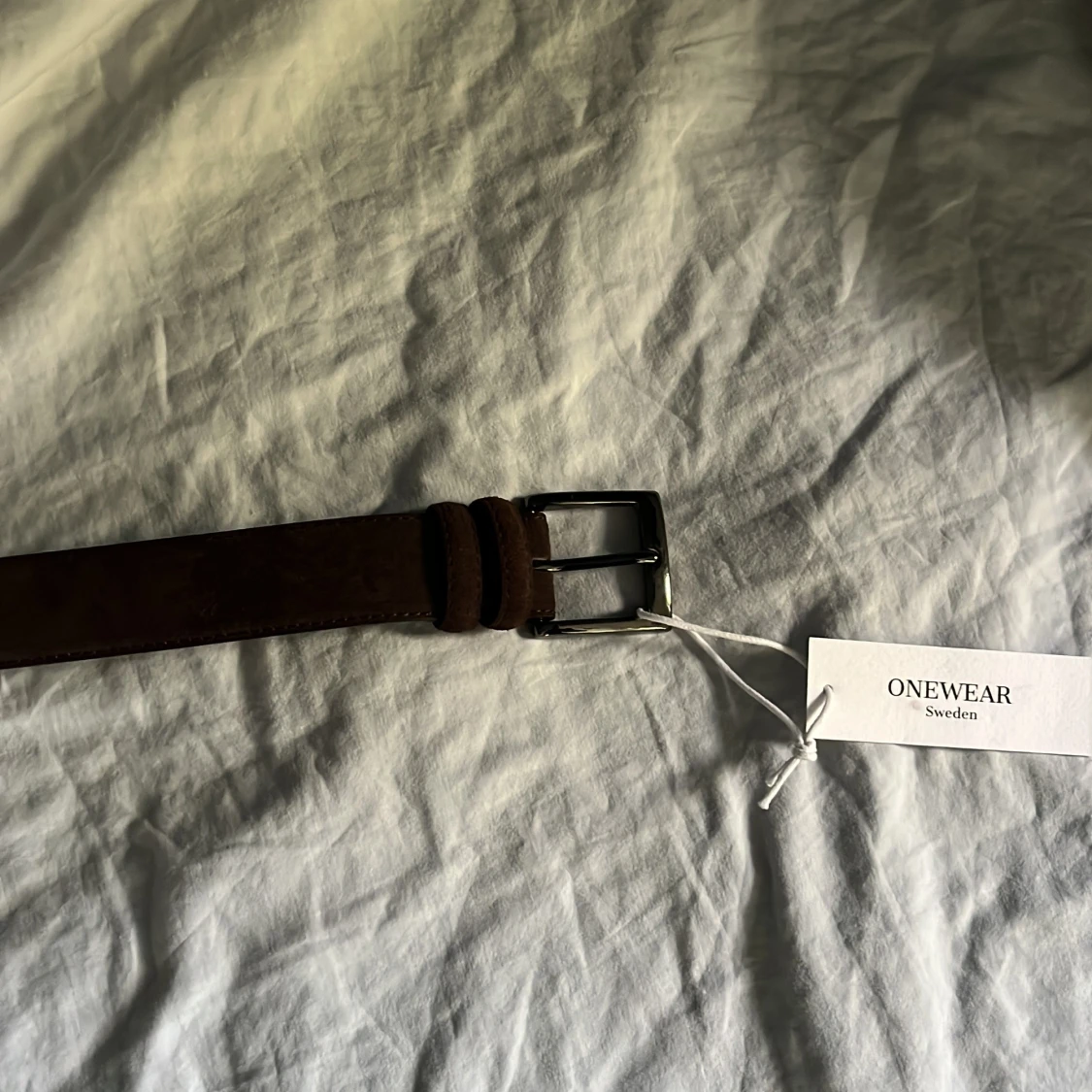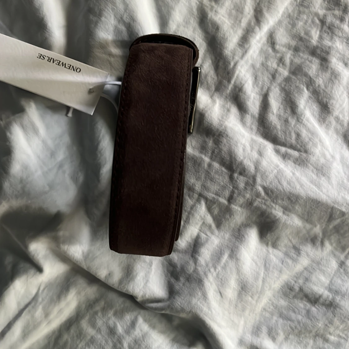 Snyggt brunt bälte i mocka från Onewear Sweden med stilren silverfärgad metallspänne. Bältet har en klassisk rak form och kommer med originalpåse. Perfekt för att lyfta din outfit med en sofistikerad touch.