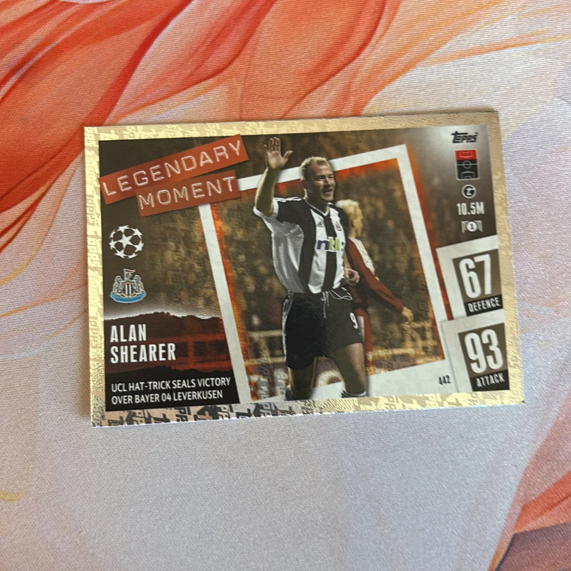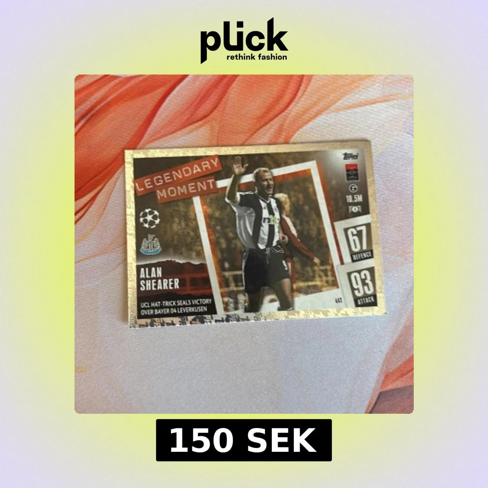 Samlarbild med Alan Shearer från Newcastle United, med texten 'Legendary Moment'. Kortet har guldkanter och visar Shearer i svartvit matchtröja. Statistiken visar 67 i försvar och 93 i anfall. Text om UCL-hattrick mot Bayer 04 Leverkusen.