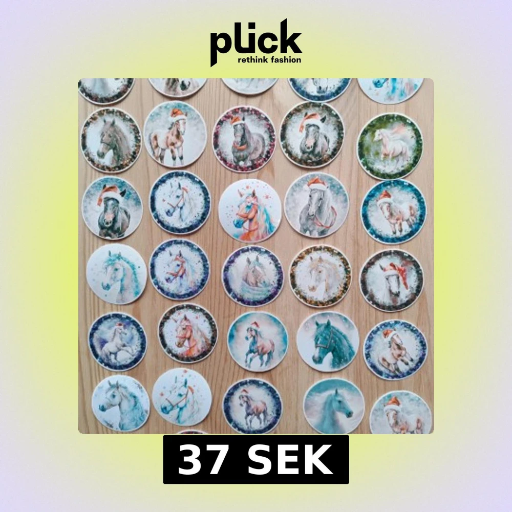 Den uppladdade bilden visar runda klistermärken med hästmotiv, många med julmotiv som tomteluva. Ingen elektronikprodukt syns på bilden.