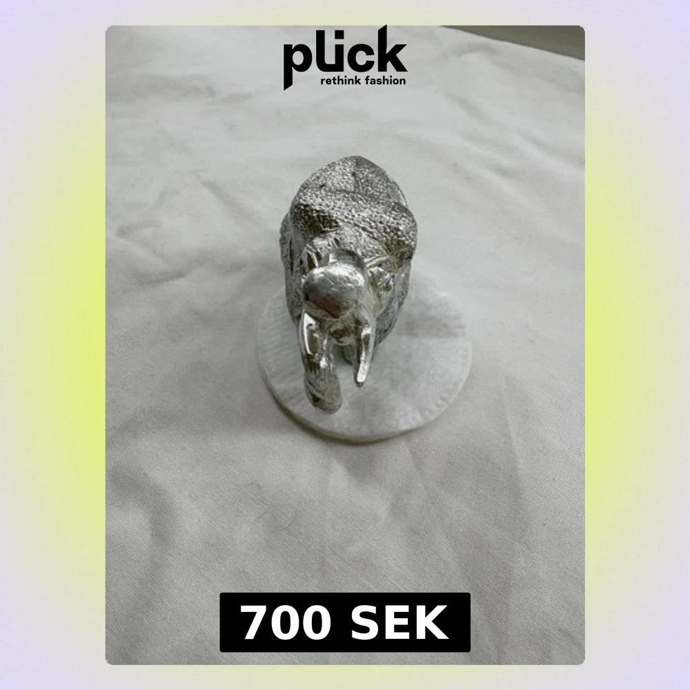 Säljer en dekorativ elefant i silverfärgad metall med detaljerat mönster på kroppen. Elefanten har uppåtsträckt snabel och står på fyra ben. Perfekt som prydnad till hyllan eller skrivbordet.
