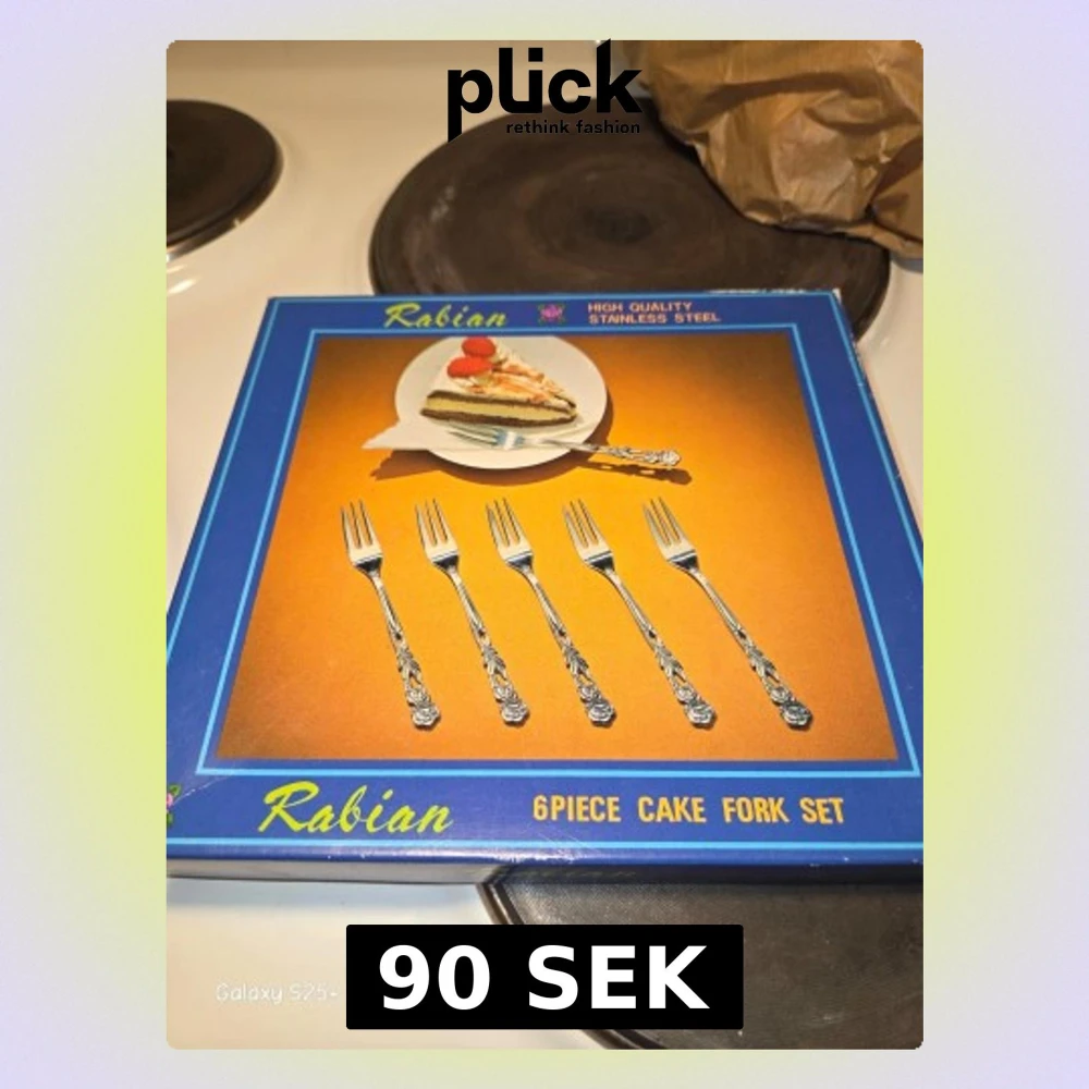 Säljer ett set med sex kakgafflar från Rabian i rostfritt stål. Gafflarna har ett dekorativt handtag med blommönster och levereras i originalförpackning. Perfekt till fika eller dessertbordet.