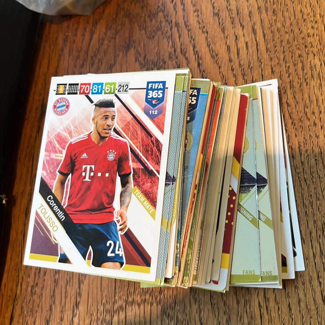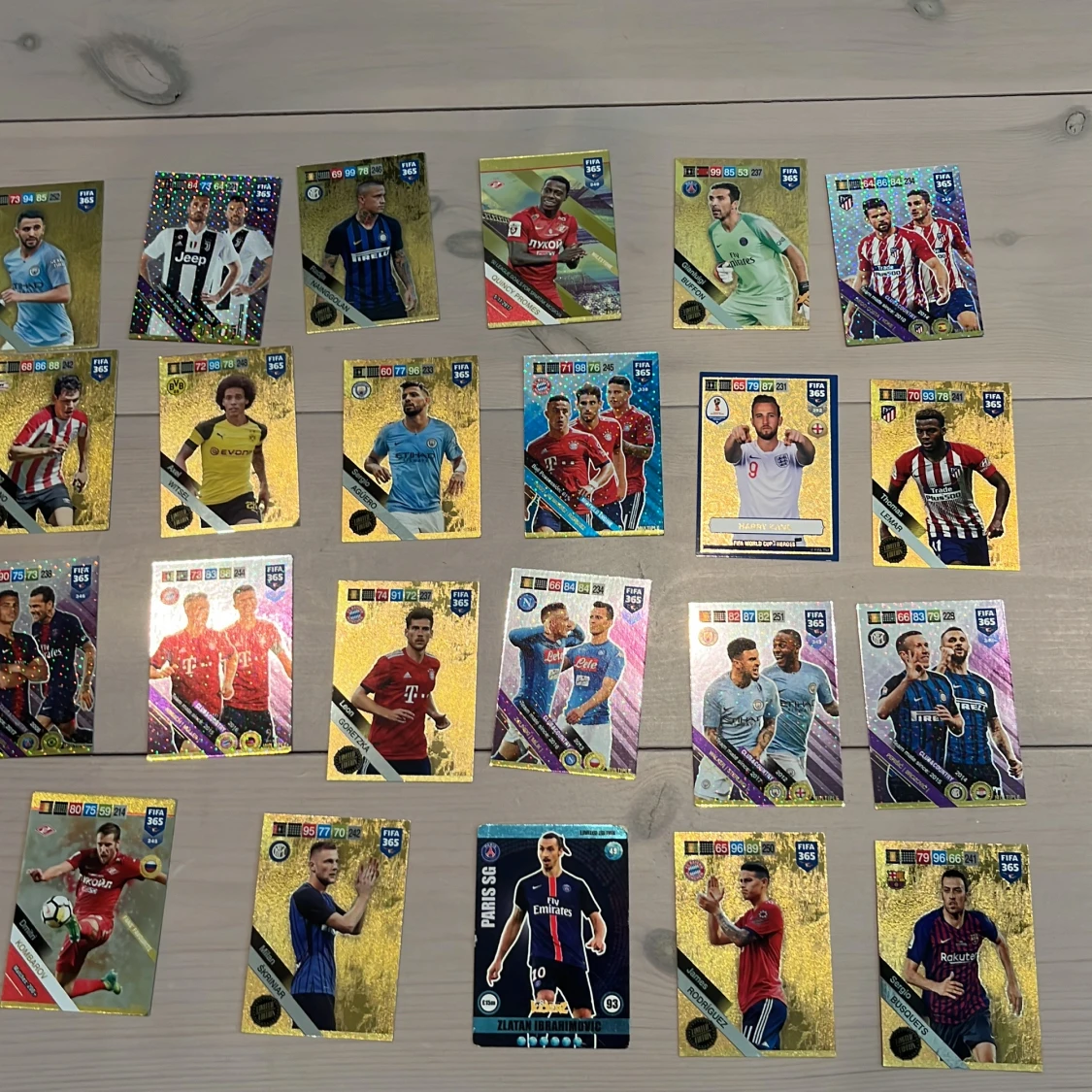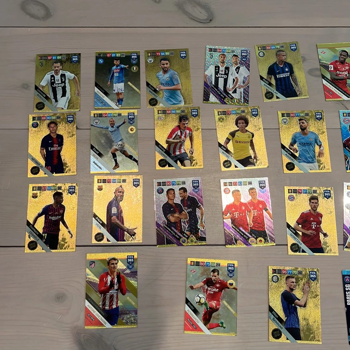 Samling av FIFA 365 fotbollskort med kända spelare och lag från hela världen. Perfekt för dig som älskar fotboll, vill byta med vänner eller bygga din egen drömsamling. Färgglada och glittriga kort som gör samlandet extra kul! Korten som ligger på golvet är lite mer speciella kort bland annat limited edition som många är. De korten som ligger i högen är lite mer vanliga kort. Jag kan sälja kort separat men säljer gärna alla tillsammans.