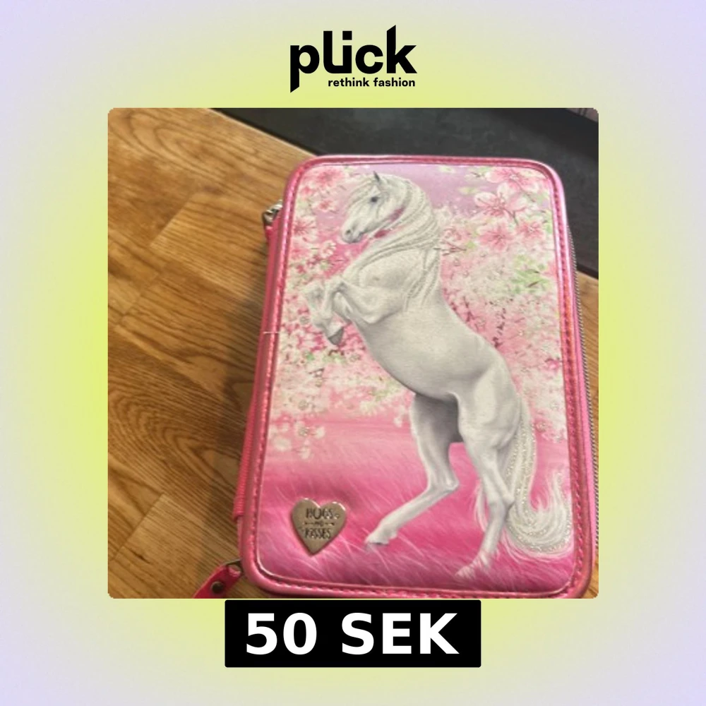 Supergullig rosa plånbok med glittrande hästmotiv och blommor på framsidan. Insidan är dekorerad med små hästar och har flera fack och resårband för att hålla ordning på småsaker. Perfekt för dig som älskar hästar och vill ha något unikt!