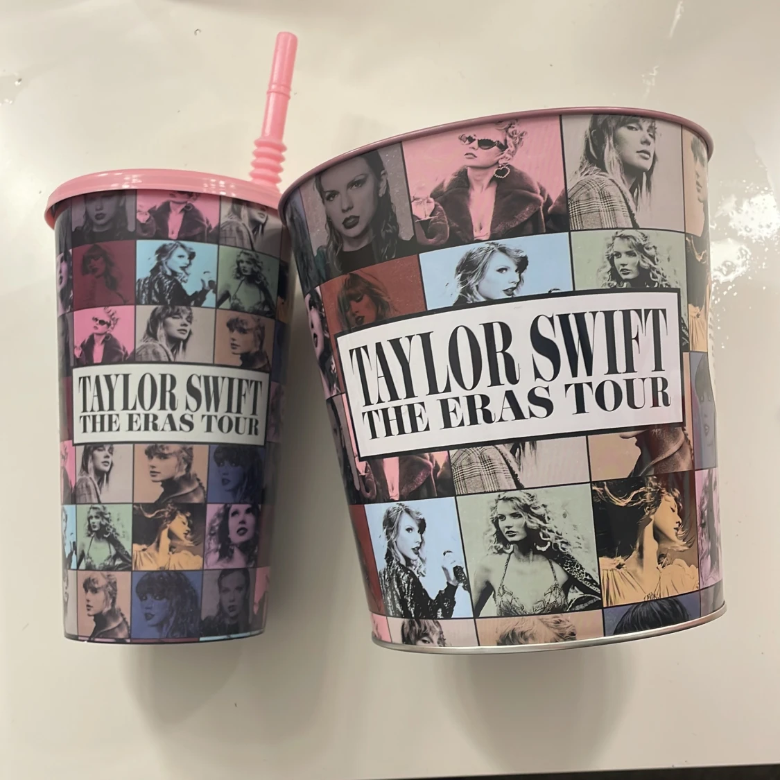 Snyggt souvenirset från Taylor Swift The Eras Tour med en dryckesbägare med sugrör och en popcornhink. Färgglad design med olika bilder från turnén. Perfekt skick, inga synliga skador eller slitage.