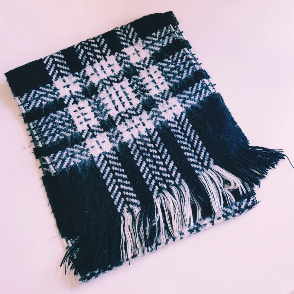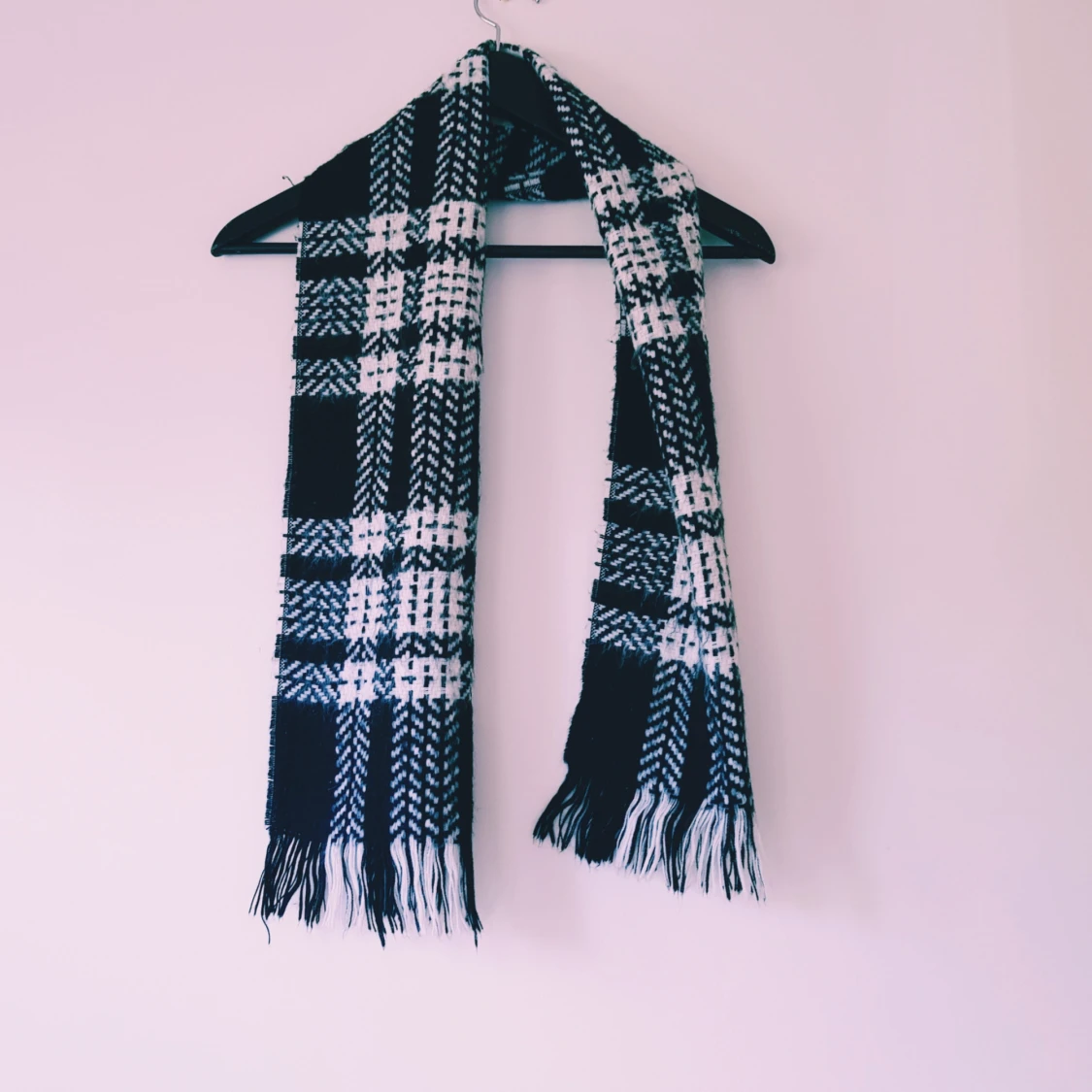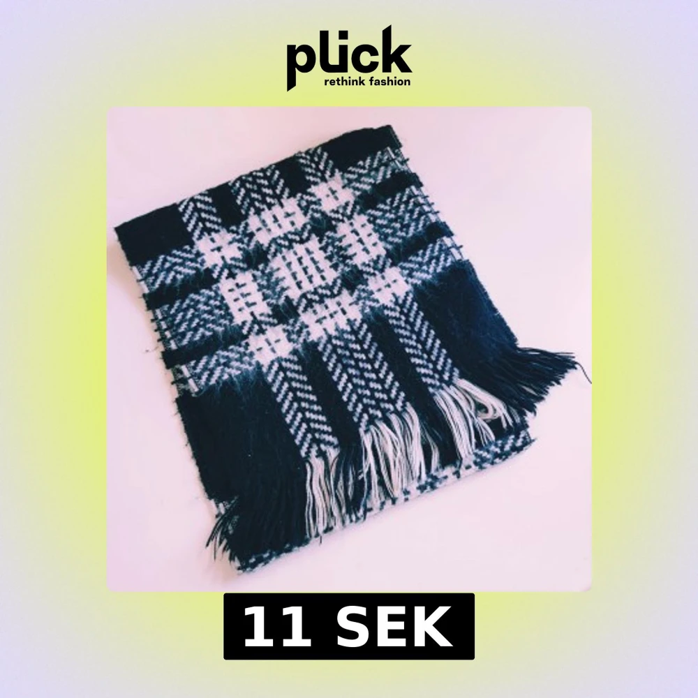 En lång och mysig halsduk i svart och vitt med klassiskt rutigt mönster och fransar i ändarna. Perfekt att slänga över axlarna när det är kallt ute. Tjockt och mjukt material som håller dig varm hela vintern. Helt & fint skick
