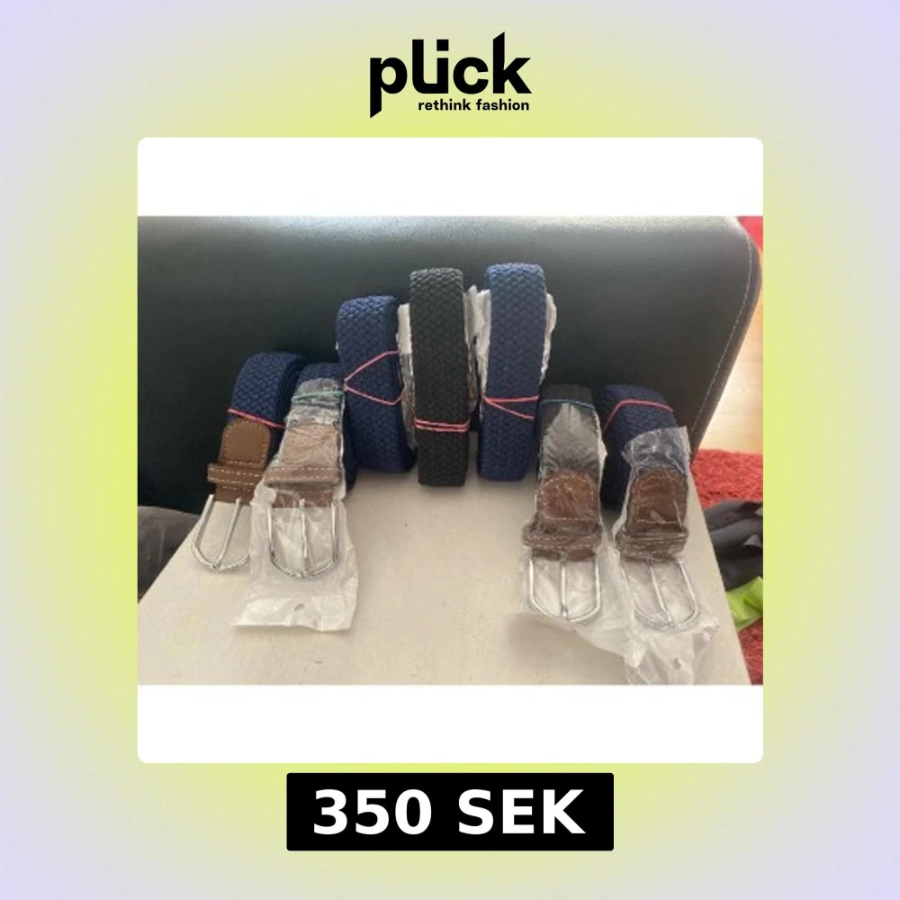 Säljer flera flätade bälten i blått och svart med bruna läderdetaljer. Bältena har en stilren design med silverfärgade spännen. Perfekta för att ge en casual look en extra touch.