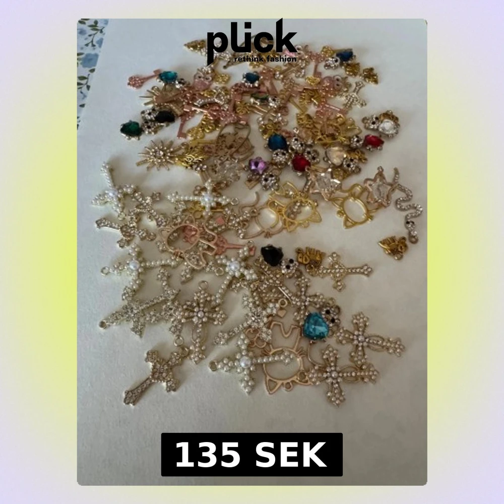 Alla på bilden ingår i paketet Säljer av lite berlocker och smyckestillbehör till bra priser på sånt vi inte använder för att göra smycken längre . Inget är äkta guld/silver Fråga gärna om storlek