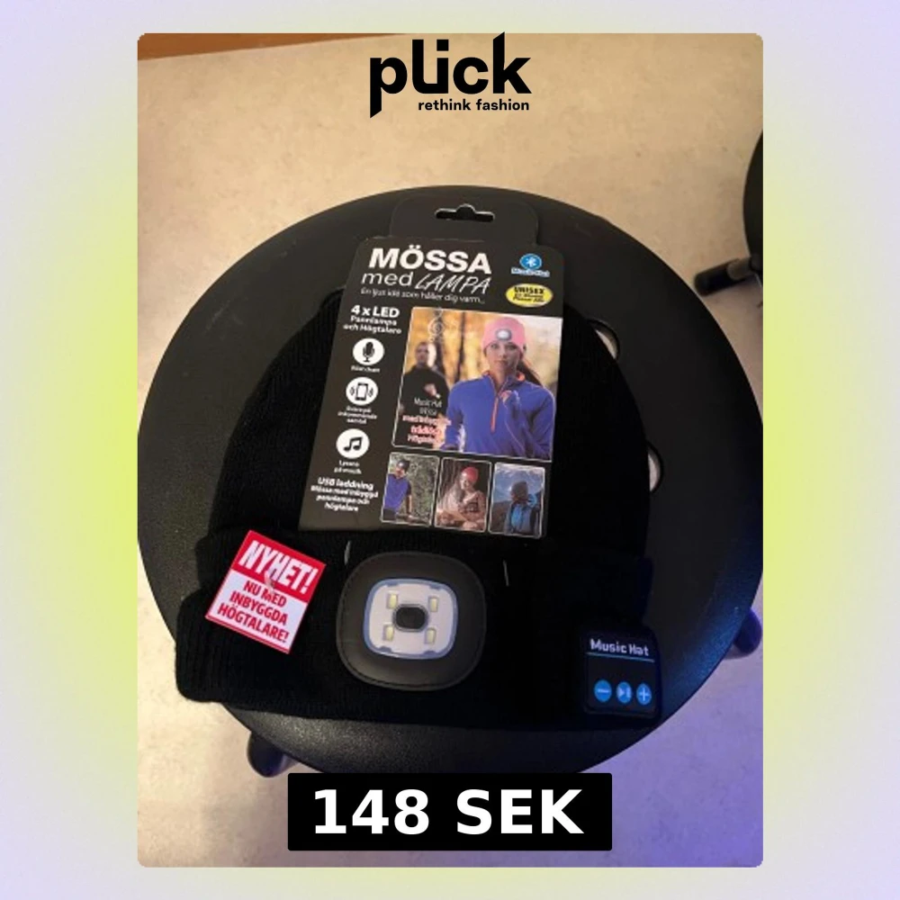 Svart mössa med inbyggd LED-pannlampa och trådlösa högtalare. Perfekt för kvällspromenader eller löpning. Mössan laddas via USB och har knappar för att styra musik och samtal direkt på sidan. Unisex-modell i mjukt syntetmaterial.