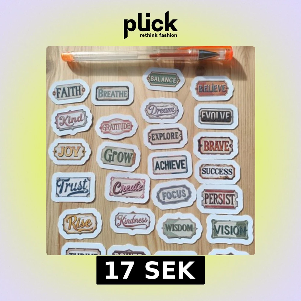 En inspirerande stickersamling med ord som 'Dream', 'Achieve', 'Brave' och 'Wisdom'. Perfekt för att peppa dig själv, dekorera anteckningsböcker eller skapa vision boards. Färgglada och motiverande ord för unga kreatörer och drömmare.