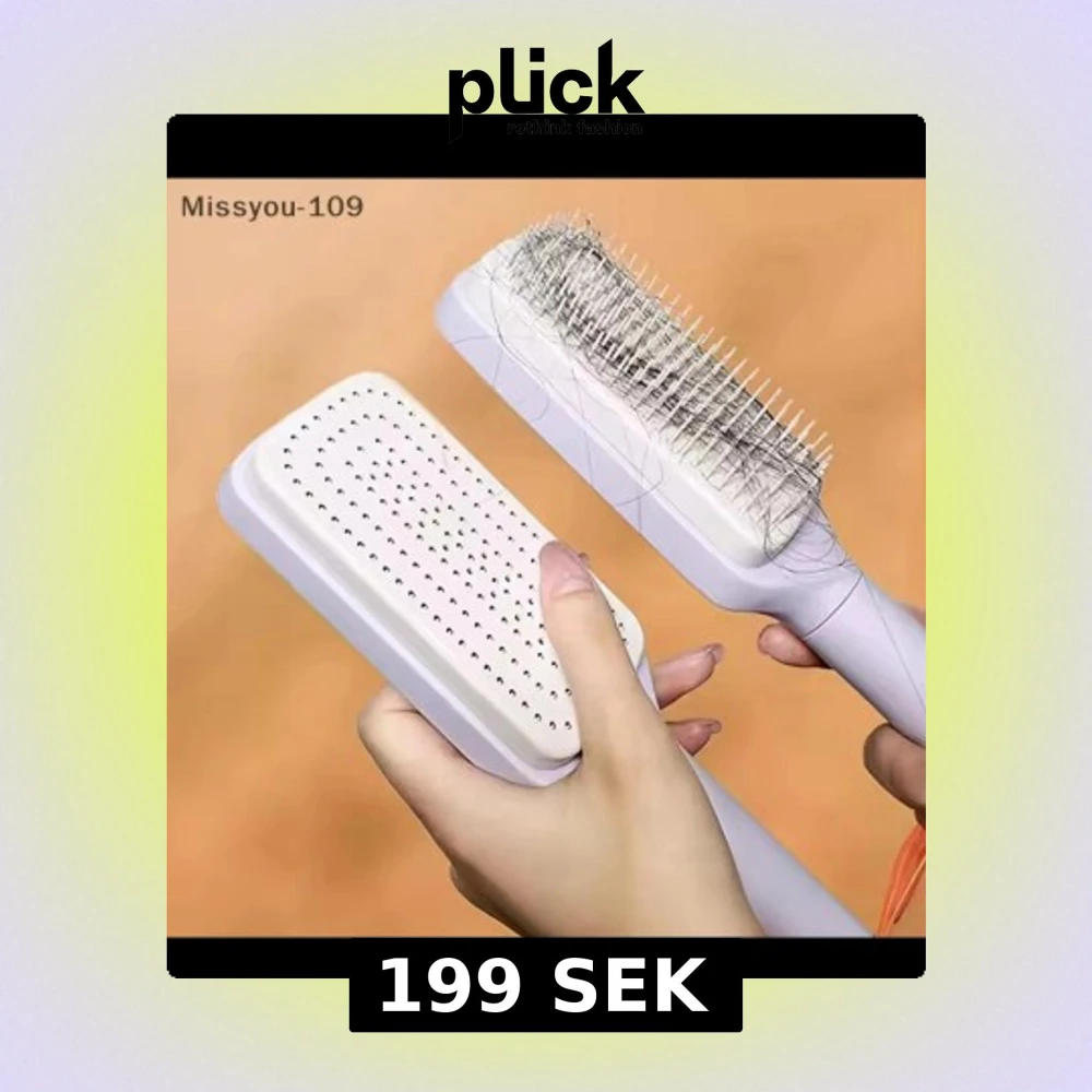 Bilderna visar en hårborste med avtagbart lock för enkel rengöring, inte en väst. Produkten är i plast och finns i lila och svart.