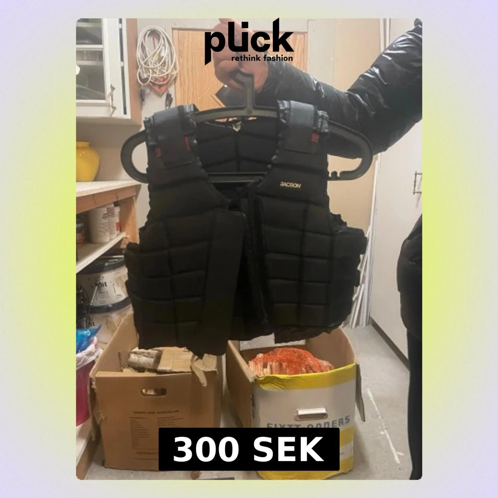 Säljer en svart skyddsväst från Jacson med quiltad design och breda kardborreband i sidan för justerbar passform. Västen är vadderad och har en sportig look, perfekt för ridning. Passar dig som vill ha både säkerhet och stil. Passar ungefär för 10-11 år.