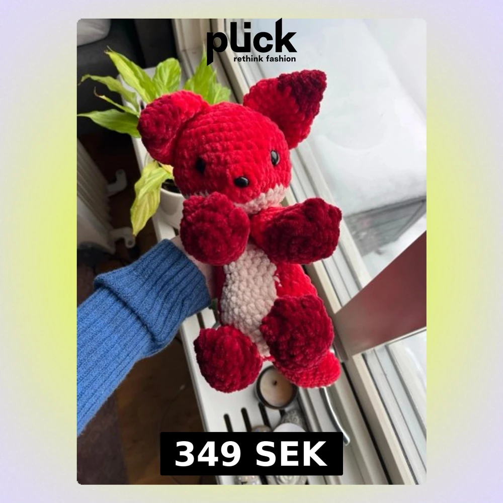 Virkad röd räv med beige och mörkröda detaljer.❤️ !Dessa innehåller säkerhetsögon som inte rekommenderas för barn under 3 år!