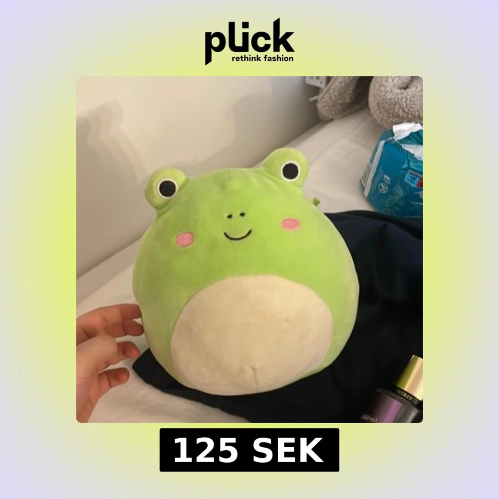 Bilden visar en grön och vit mjukisgroda med rosa kinder och ett leende ansikte. Ingen sminkprodukt syns tydligt på bilderna.