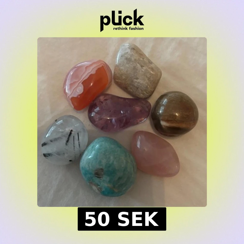 Säljer ett set med sju olika polerade kristaller och stenar. Innehåller bland annat en rosa rosenkvarts, en blågrön amazonit, en lila ametist, en brun tigeröga, en orange agat, en vit sten med svarta streck och en beige sten. Perfekt för dig som gillar kristaller och mineraler. (Vet ej om dom är äkta) säljer alla för 50 eller 10kr styck