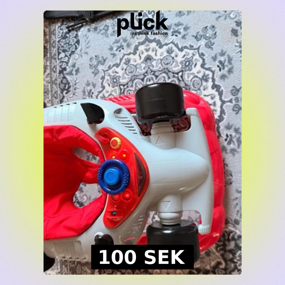 Säljer en cool gåstol formad som en bil i rött och grått med svarta hjul och blå ratt. Sätet är mjukt och rött, och det finns flera färgglada knappar på instrumentpanelen. Perfekt för små barn 6-9 månader som vill utforska hemmet på ett roligt sätt