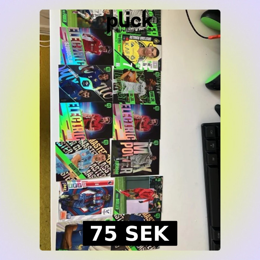 Säljer en samling fotbollskort från Panini Adrenalyn-serien. Korten har färgglada och glansiga designer med olika fotbollsspelare, inklusive specialkort som Electric, Power och Master. Perfekt för dig som gillar att samla på fotbollskort eller vill byta med vänner.