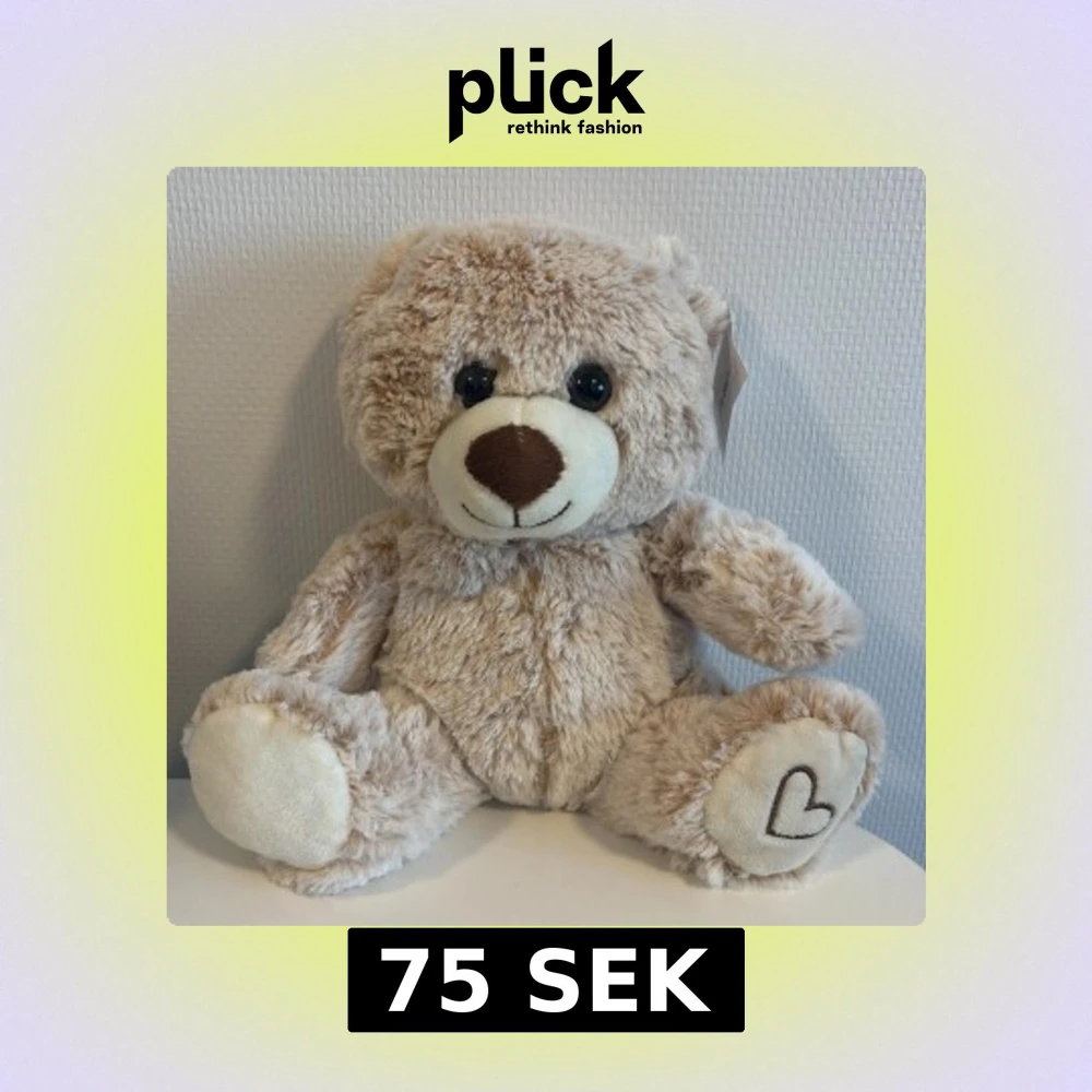 Mysig och fluffig nallebjörn i beige plysch med stora svarta ögon och en brun nos. Ena tassen har ett broderat hjärta. Perfekt som present eller dekoration. Sitter stadigt och har mjuk stoppning. 23 cm