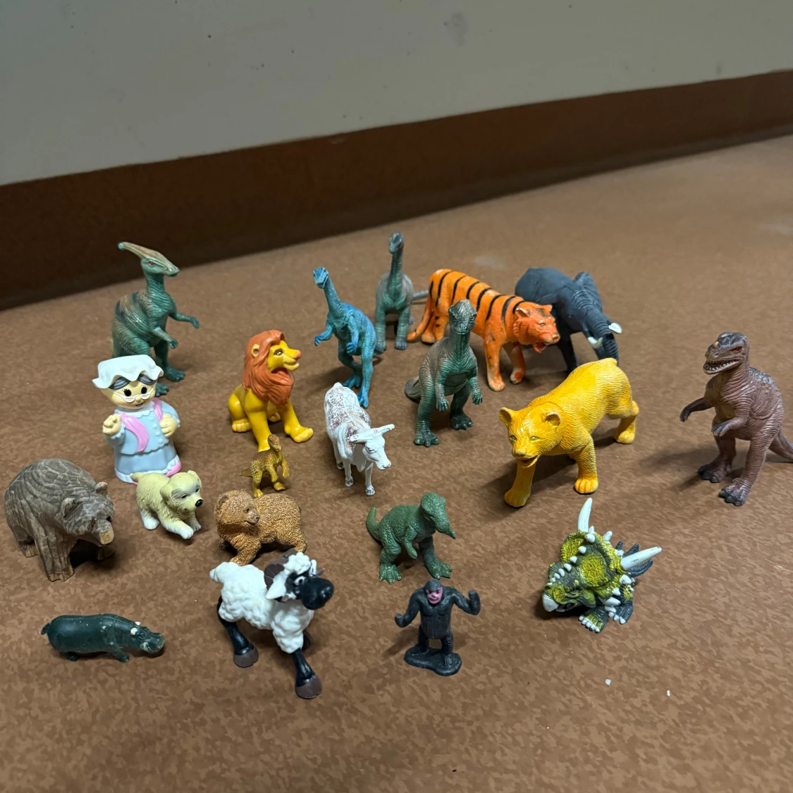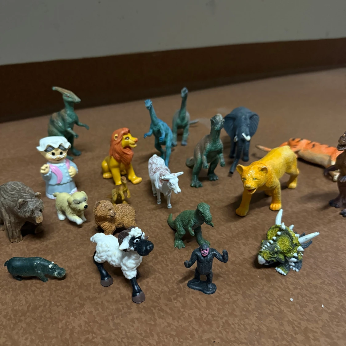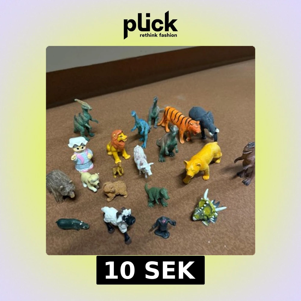 plastfigurer: dinosaurier, lejon, tiger, elefant, får, björn, hund, apa, och fler. Färgglada och varierade, vissa med mindre slitage men i gott skick. Perfekt för lek eller samling. 10 kr st