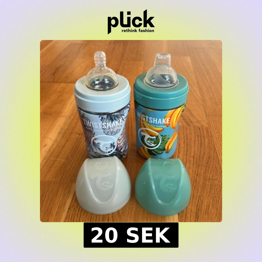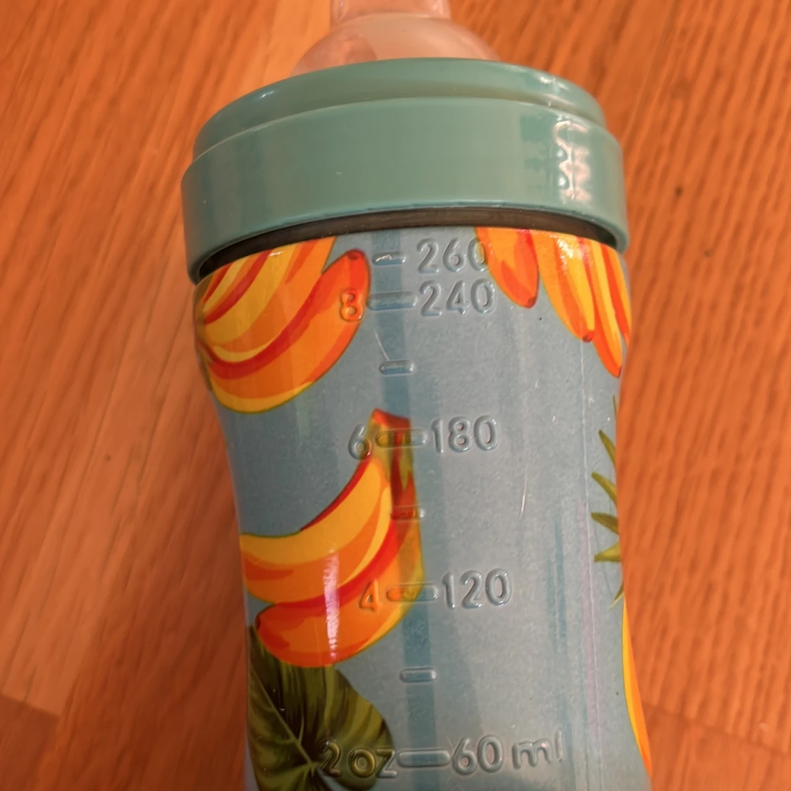 Två nappflaskor med ananas ritning och banan. Nappflaskorna rymmer med 260 ml innehåll. De har olika nappar på flaskorna o har lock så att inget spils. Fina, söta o stiliga