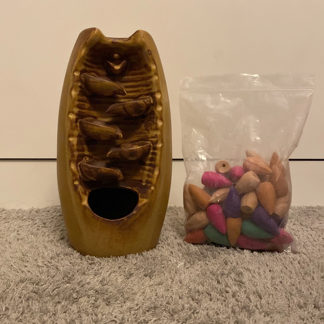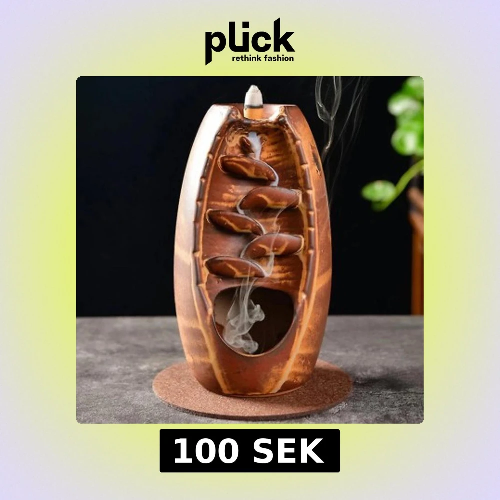 Säljer en brun keramik rökelsefont med vattenfallsdesign. Medföljer en påse med färgglada konformade rökelsestickor. Perfekt för att skapa en mysig och avslappnad stämning hemma. Fontänen har flera nivåer där röken rinner ner som ett vattenfall.