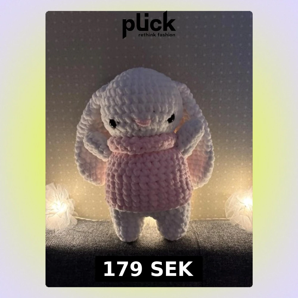 Virkad amigurumi kanin med en rosa tröja med krage. Allt virkat i polyester. đ«¶đŒ