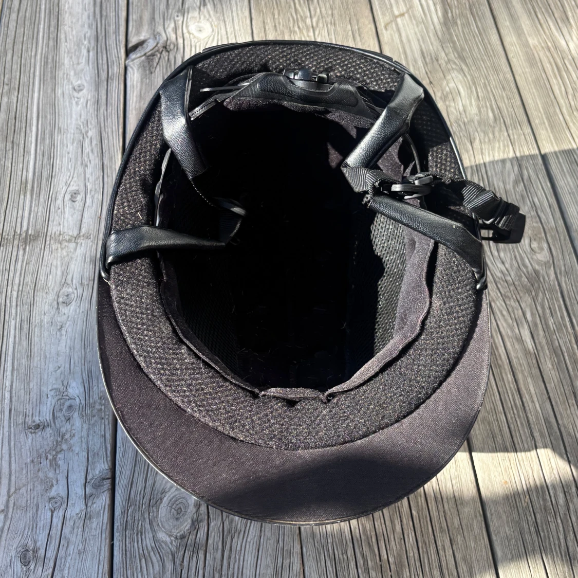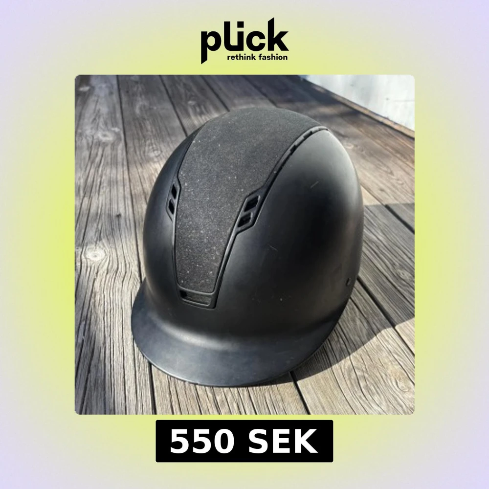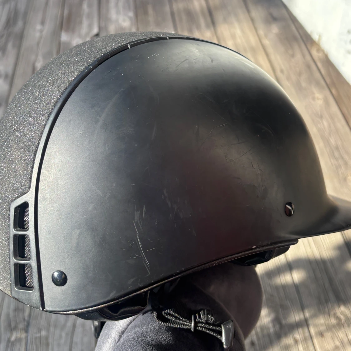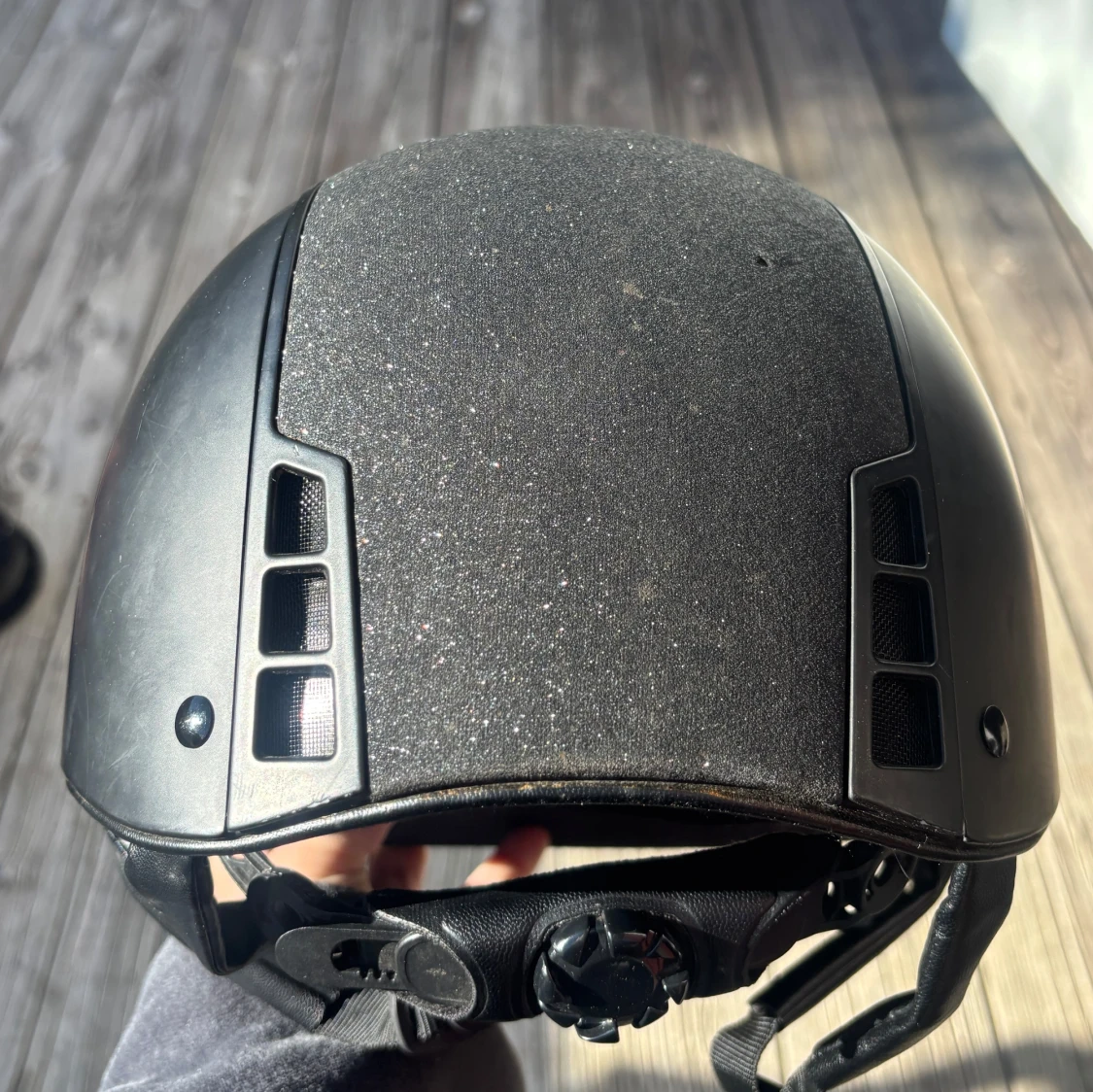 Snygg svart ridhjälm med glittrig yta på ovansidan och ventiler på sidorna för extra luftflöde. Hjälmen har justerbart spänne och vadderad insida för skön passform. Perfekt för dig som vill ha stil och säkerhet när du rider.
