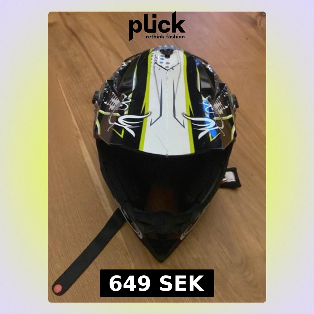 Säljer en cool motocrosshjälm med svart, vit och gul design. Hjälmen har grafiska detaljer med prickigt och abstrakt mönster, samt snygga linjer och motiv på sidorna. Utrustad med hakskydd och justerbar skärm framtill. Perfekt för dig som gillar att sticka ut på banan. Men den har lite jack/ repor på sig men inget man tänker på. Det har jag inte tänkt på.