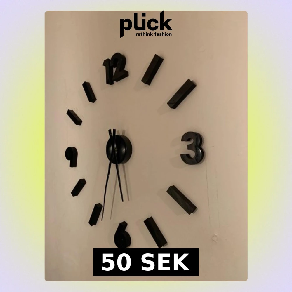 Säljer en stilren svart väggklocka med stora 3D-siffror och minimalistisk design. Klockan har svarta visare och siffror i plast som monteras direkt på väggen, vilket ger en modern och cool look till rummet. Perfekt för dig som gillar grafisk och enkel inredning.