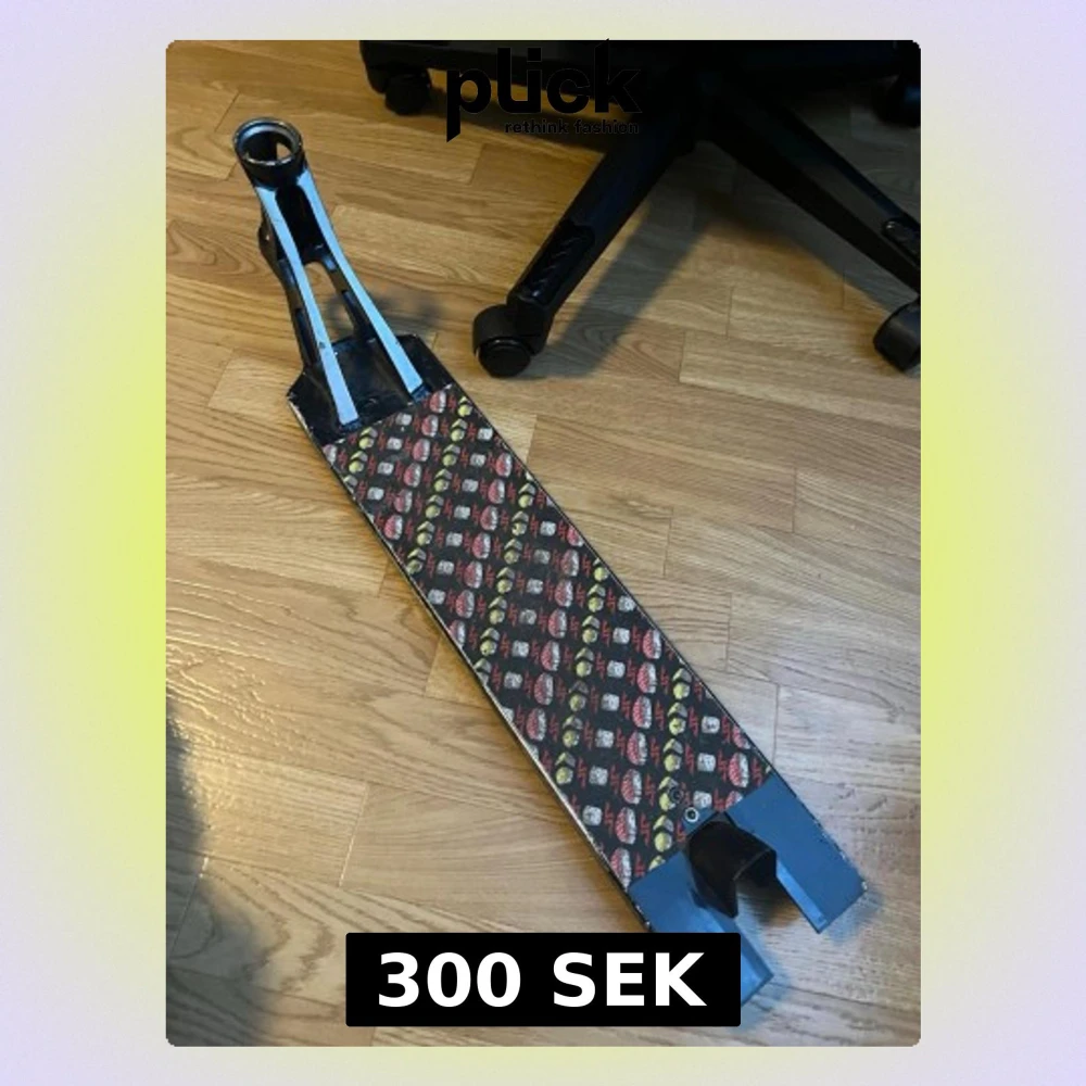 Säljer ett svart sparkcykeldeck med färgglatt mönstrad griptape med loggor. Deckets form är rektangulär med vinklade kanter och öppet bakparti för hjul. Passar till trick- eller stuntkickbike och är tillverkat i metall.