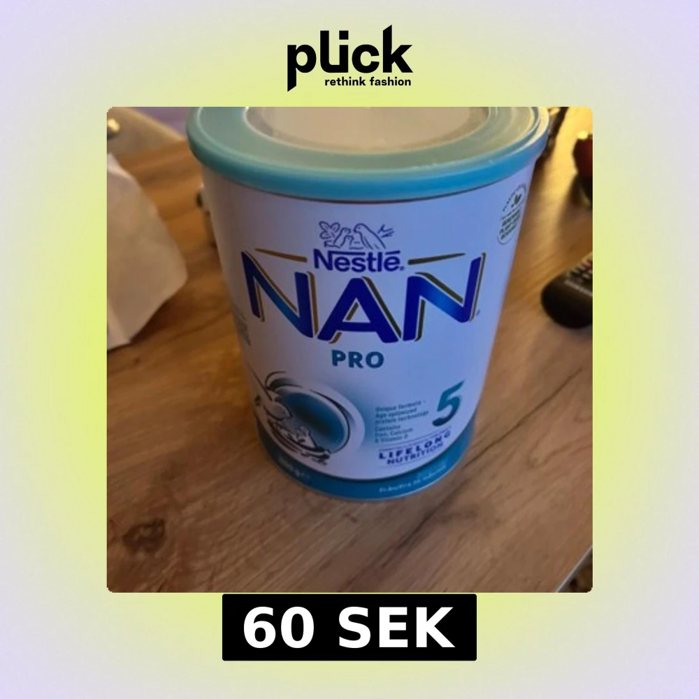 Bilderna visar en burk med pulverformad barnmat från Nestlé, NAN PRO 5. Detta är dock inte en bok, utan ett livsmedel för småbarn. Ingen information om boktitel, författare eller innehåll kan identifieras.