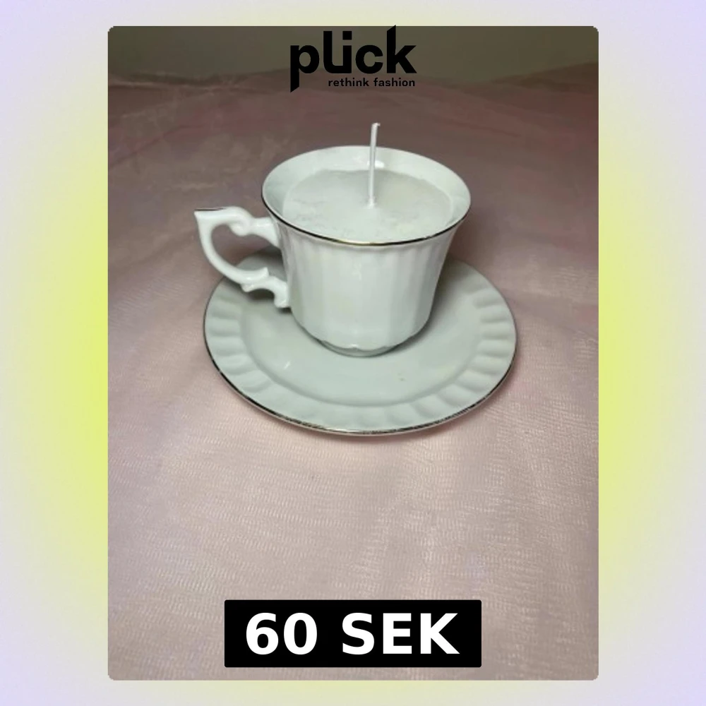 Det här ljuset är gjort av återanvändbara material. Tekoppen är köpt secondhand och stearinet är från kyrkor som tänkte slänga det. Det här ljuset har en svag doft utav vanilj, så känsliga även kan använda det. Det finns fler ljus i samma design på hemsidan ifall man vill köpa sets.
