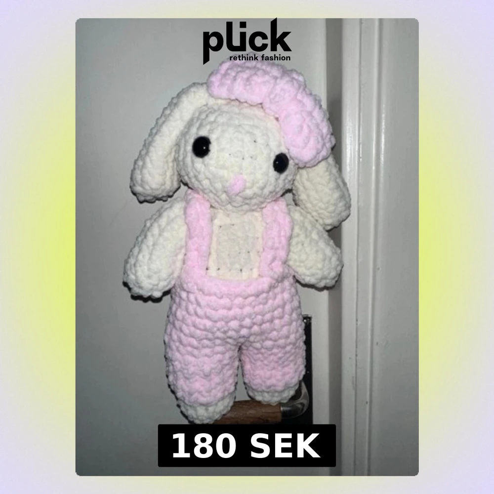Söt handgjord kanin i mjukt, fluffigt garn. Kaninen är vit med stora svarta ögon och har rosa byxor med hängslen samt en matchande rosa roset. Perfekt som dekoration eller gosedjur. Ca 30 cm hög